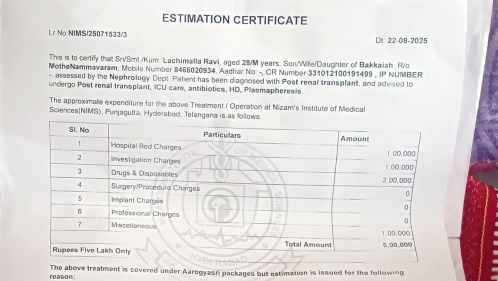 After battling kidney disease for five long years, Ravi finally received a kidney transplant a few days ago. His family spent all their savings on his surgery and medical care in hopes of saving his life.