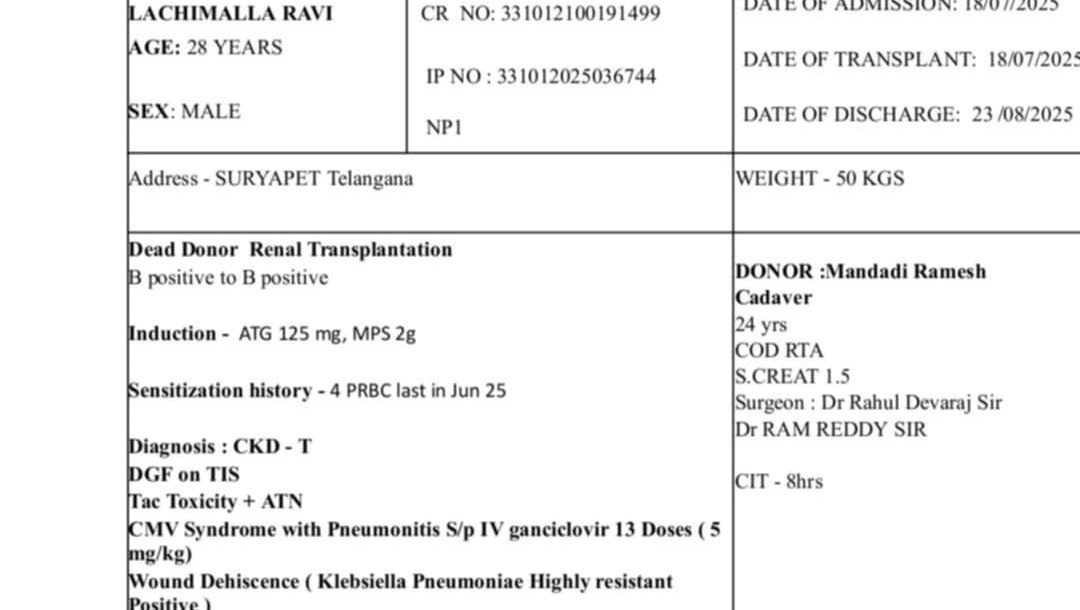 While the transplant was successful, he is now facing post-transplant complications—a blood infection caused by the new kidney. This requires him to undergo medical checkups four times a week and take medications costing nearly ₹25,000 per week. The ongoing expenses have pushed his family into severe financial distress.