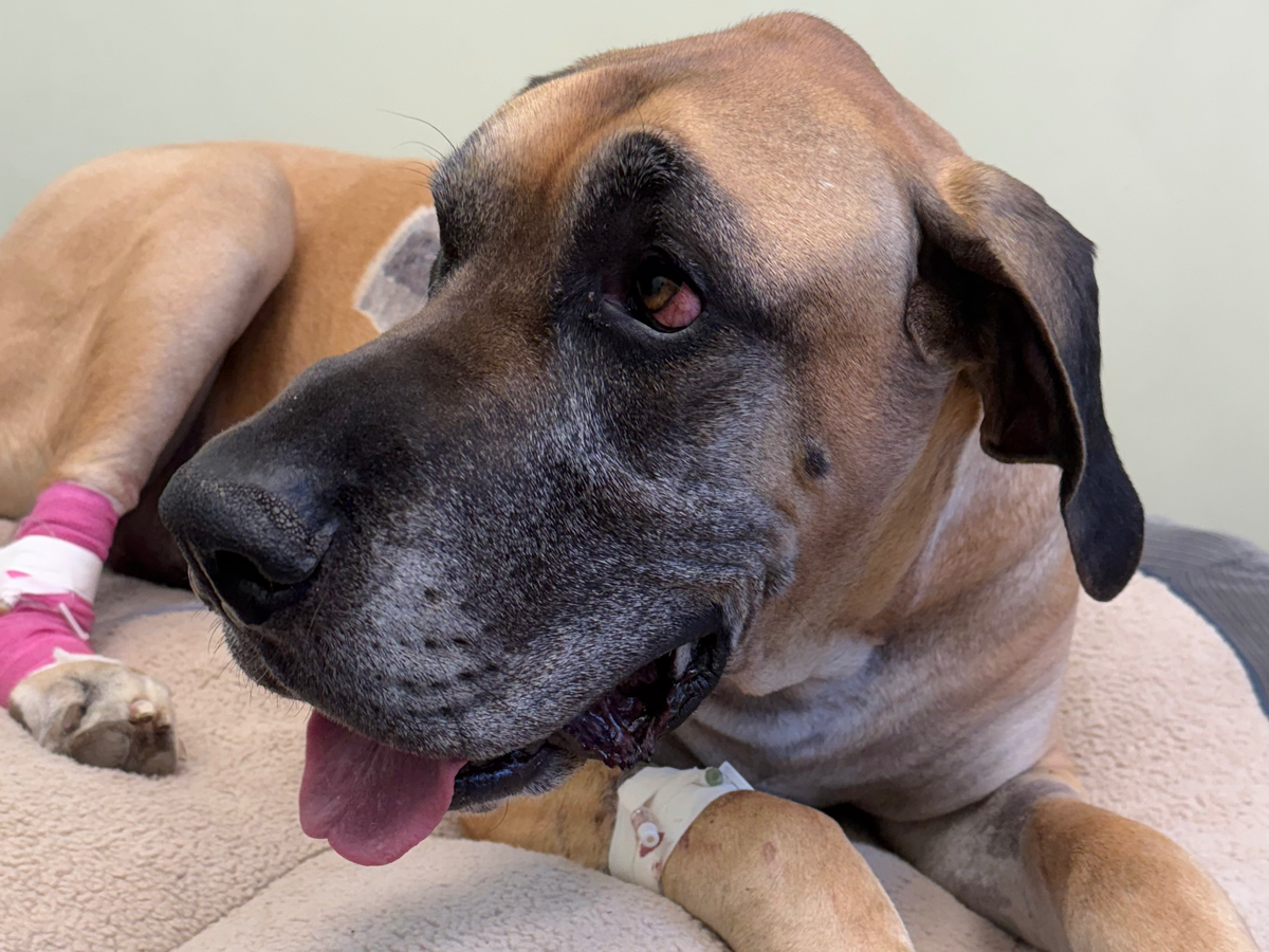 This is Rex. He is 204 pounds and a 5 year old Great Dane. He is truly the sweetest boy ever. Before his accident, Rex was perfectly healthy.