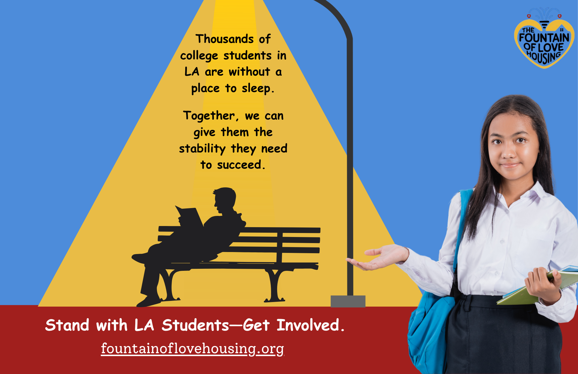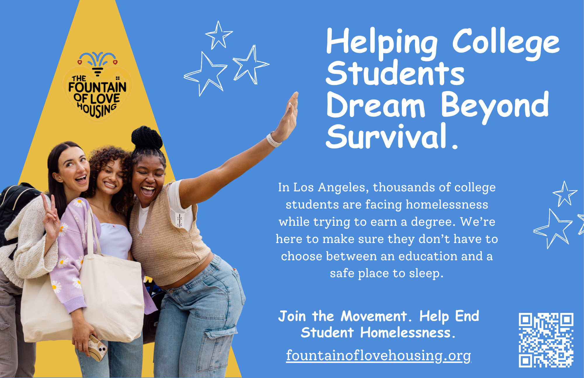 Join Fountain of Love Housing in giving these deserving students—including those who have proudly served our country—a chance to focus on their dreams, not just their survival. Together, we can provide hope and a pathway to a brighter future.