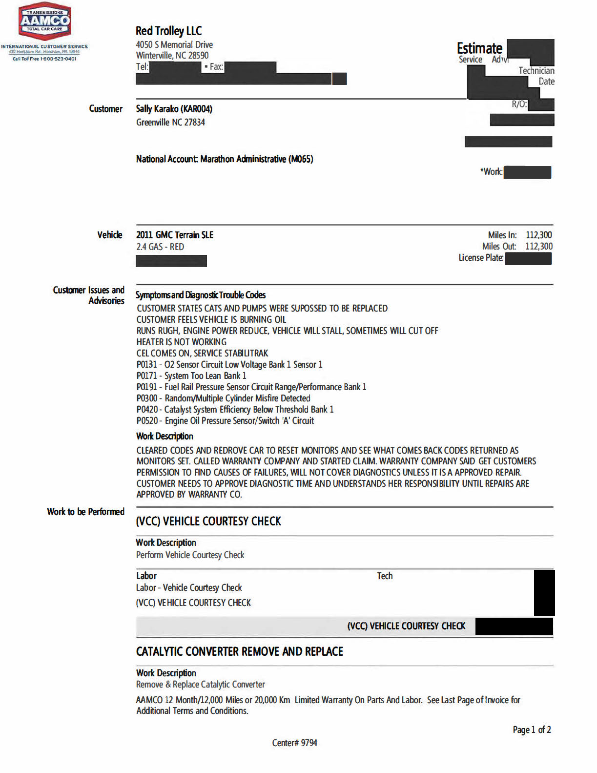 Because the catalytic converter was never replaced, the warranty company won’t approve any other repairs. I’m stuck with: