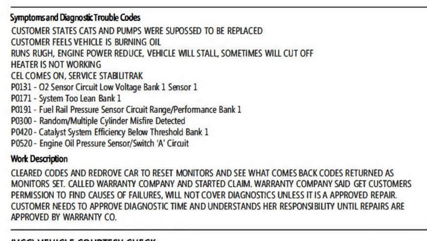 This proves the dealership never did the work they claimed they did. This is exactly why the warranty company won’t approve any other repairs until the catalytic converter is fixed out of pocket.