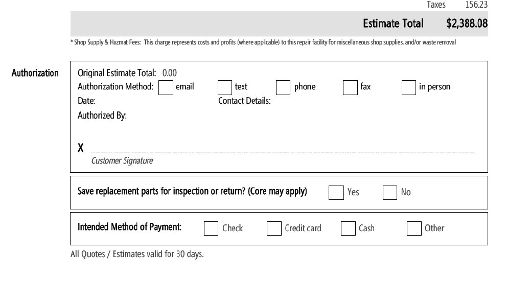 The final image is the bottom half of Page 2, showing the total cost of this repair: $2,388.08. (All quotes are only valid for 30 days.)