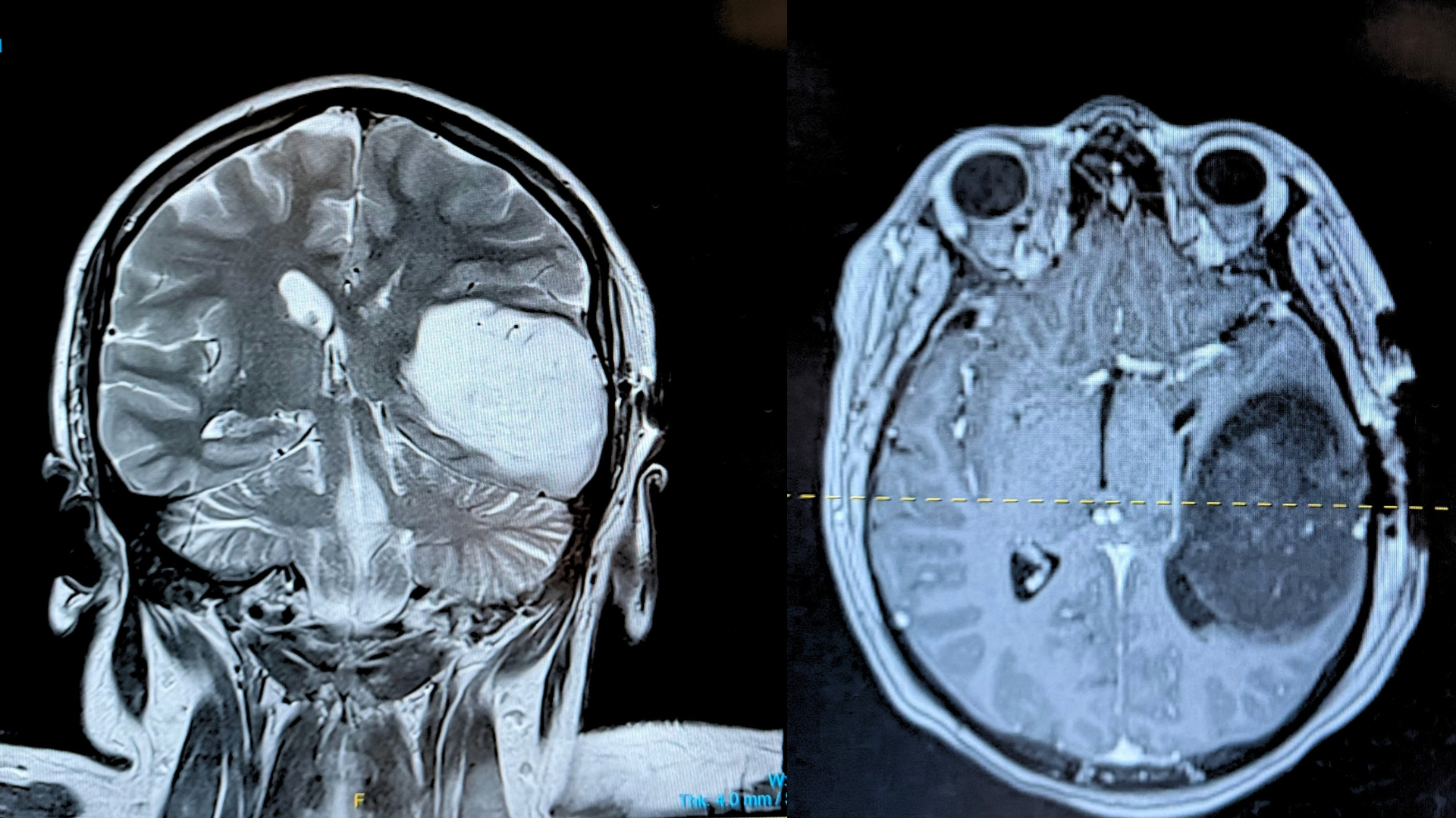 The scan revealed a large mass in the left temporal lobe of her brain—so significant that it was causing a shift across the midline. She was immediately admitted to the Neuro ICU, where she spent the next five days undergoing further testing, including a brain biopsy. The preliminary biopsy results came back abnormal, confirming that the mass is brain cancer. We are currently waiting on the full results, which will determine the exact type and grade of the tumor and guide her treatment plan.