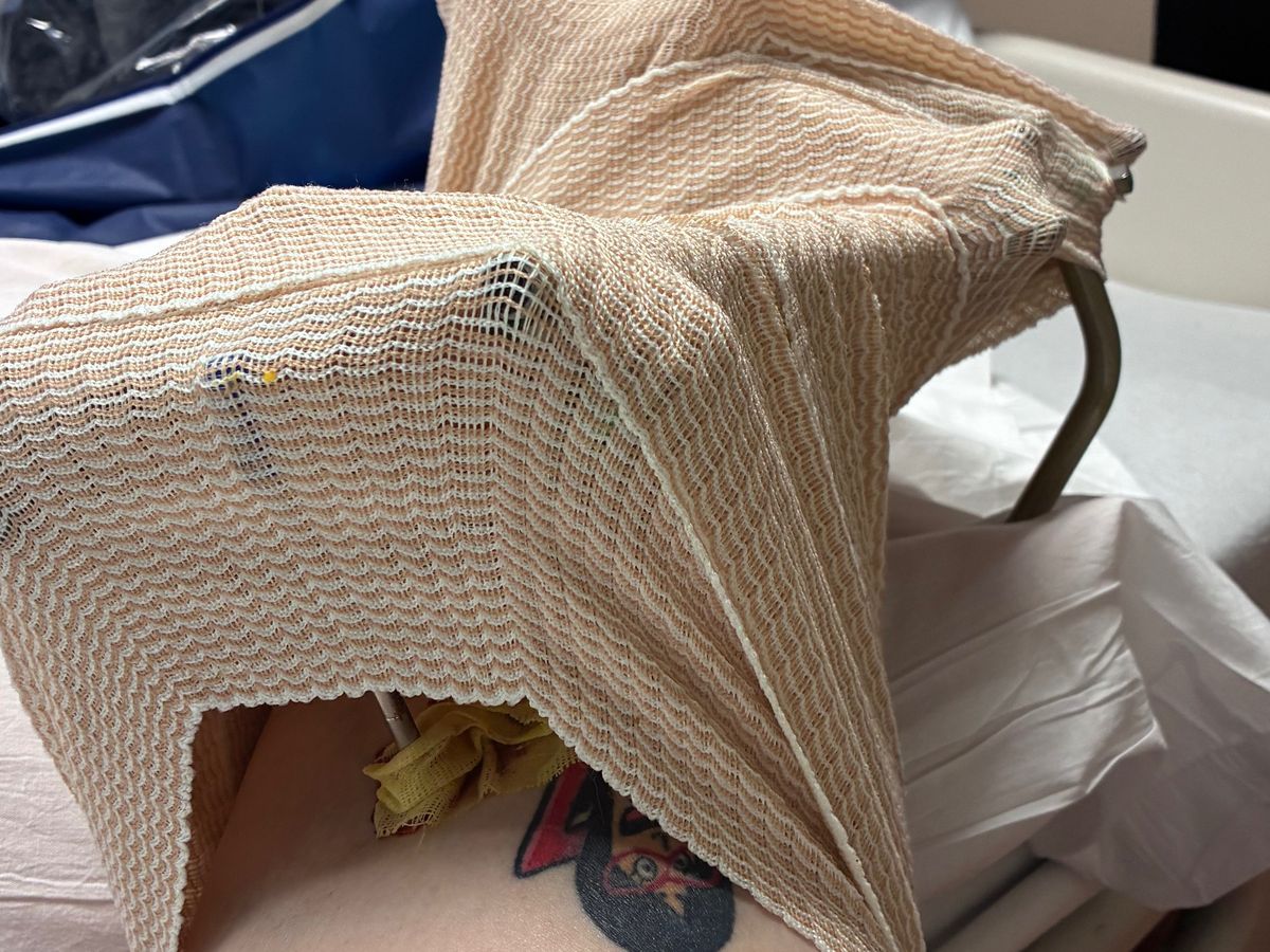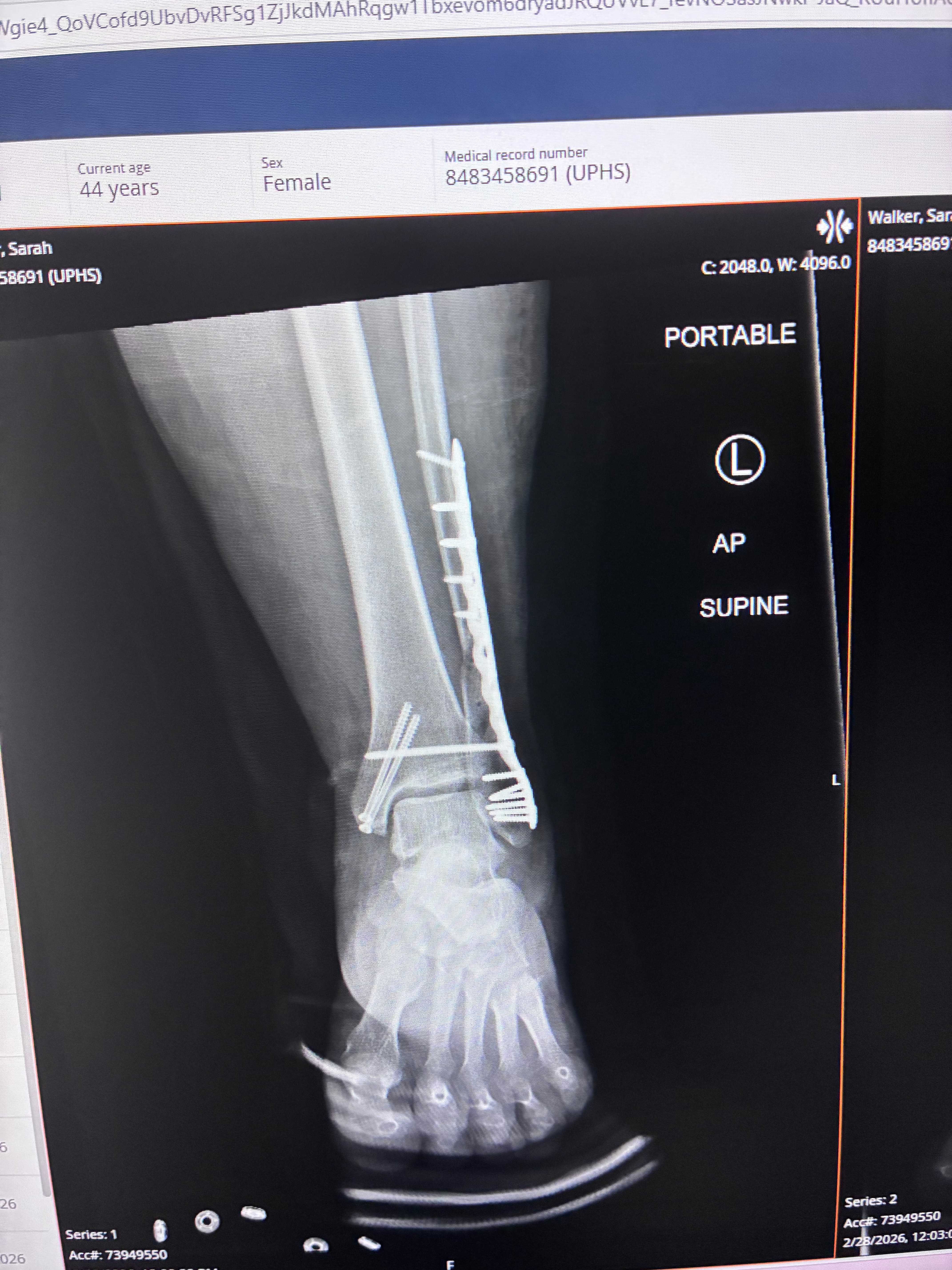 Hello, my name's Sarah, and on 2/24 I sustained a terrible injury. I slipped on ice and fell, which led to a compound fracture in my ankle and lower leg. My 10-year-old daughter placed the call to 911, while my 17-year-old daughter applied a tourniquet to my lower leg to stop the bleeding. I was rushed to the hospital where I underwent an emergency surgery to stop the bleeding and realign my bones. I've now received 2 surgeries, and I am currently recovering at home. I am unable to apply any weight to my leg, which means bed rest.