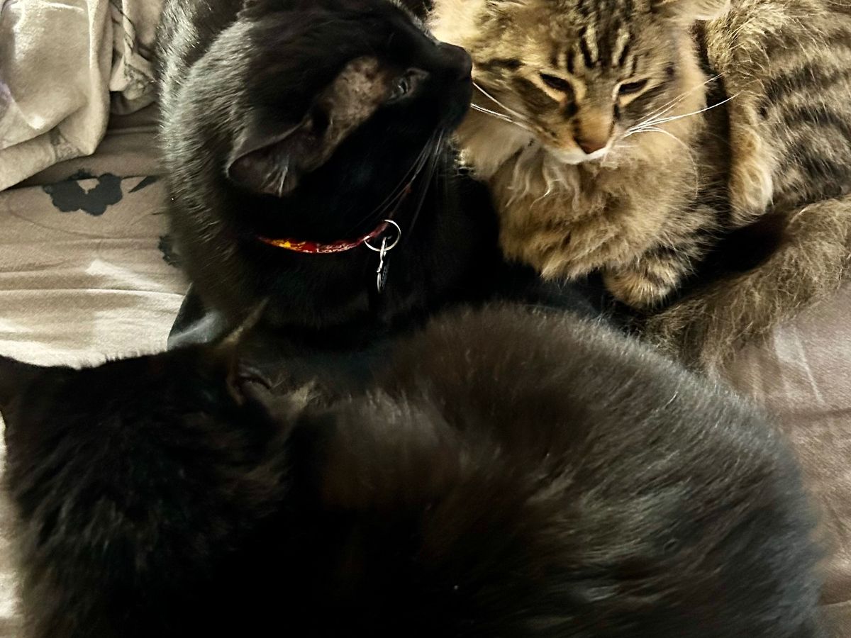 The amazing firefighters on the Oregon coast got the fire under control and rescued the cats. They were under veterinary care from Friday until Wednesday. Steve, Minnie, and Meekus got to come home today, but there's a very large vet bill that came with them. Their survival is amazing and worth every penny.