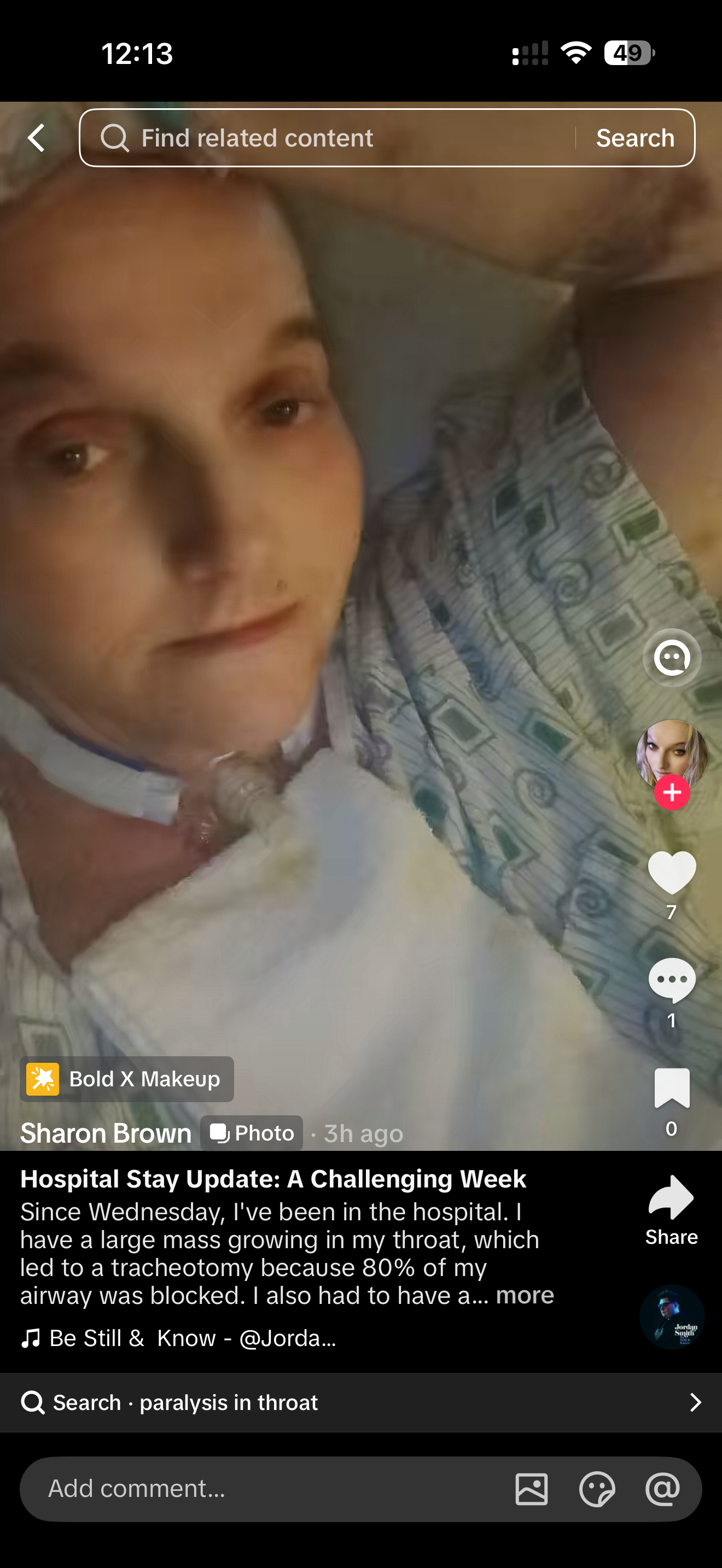 But about seven months ago, Sharon started feeling unwell with a sore throat and ear pain that wouldn’t go away. Last week, after seeing a specialist, doctors found a mass in her throat and rushed her to the hospital. She’s had part of the mass removed, but now has a trach and a feeding tube, and has lost over 80% of the function in her throat and airway. Sharon can’t work, and with her family missing work to be by her side, she’s at risk of losing her home and everything she’s worked so hard for in her recovery.