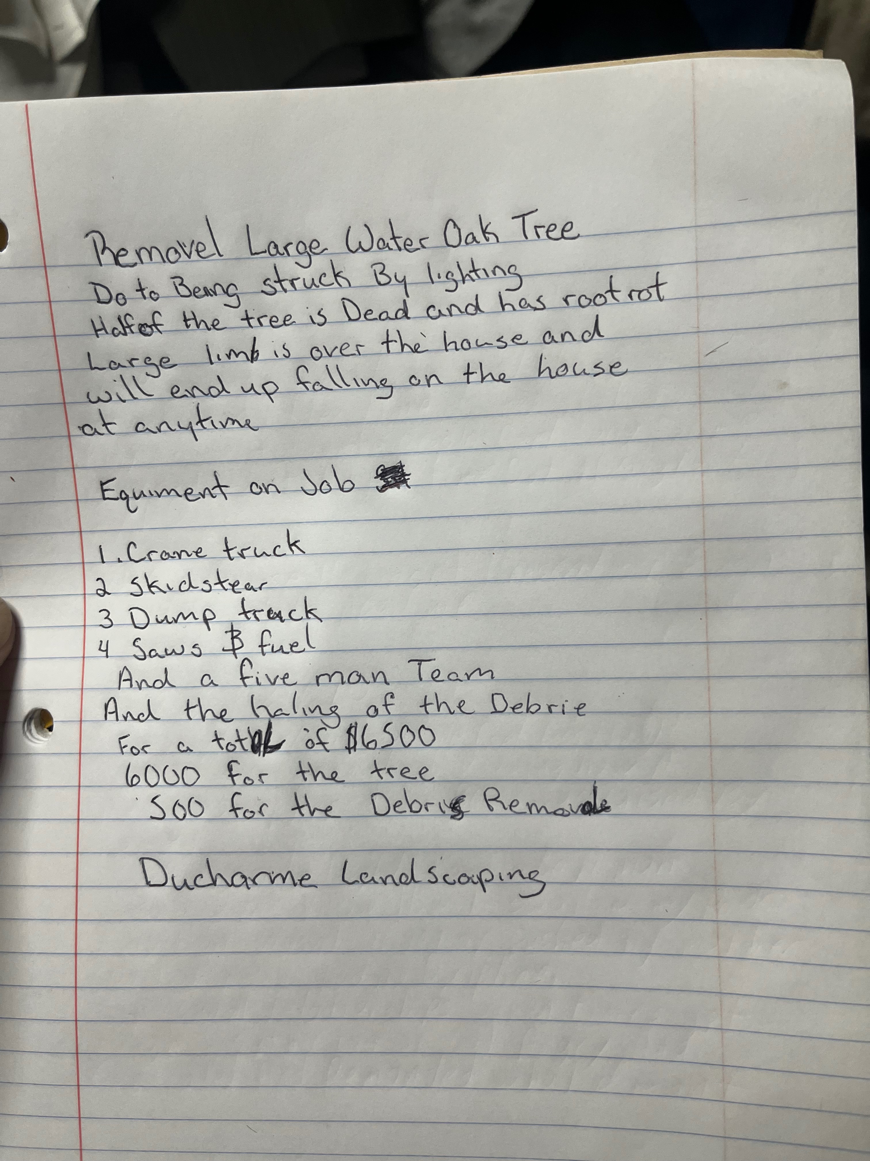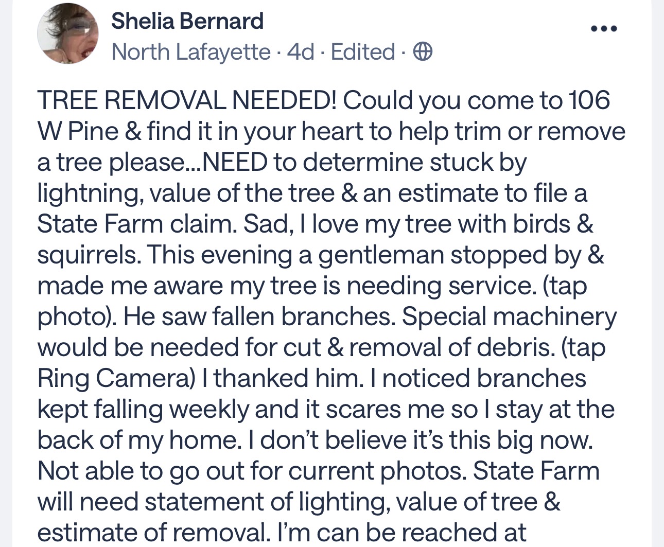 EMERGENCY TREE REMOVAL!!! Frightening to learn the tree was struck by lightning and is next to the front of my home. State Farm, since 1997, pays $750 per tree, but the deductible is $1850. Four estimates range from $6,800 to $3,850. An arborist came by and stated, "Ms., at the next wind, your tree MAY CRASH, and I'm unsure which direction."