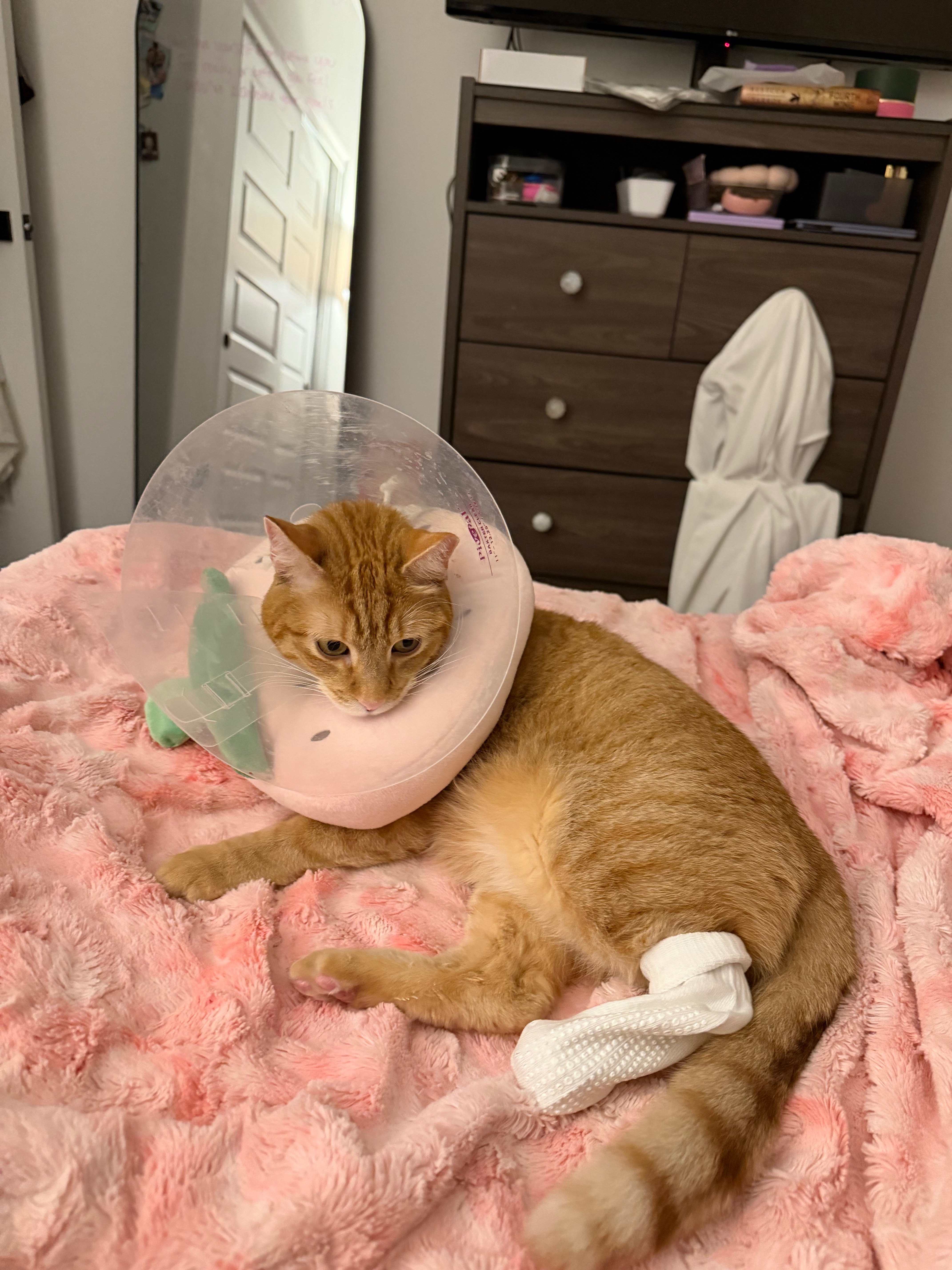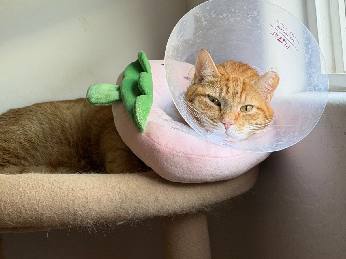 My 5 year old orange cat Skippy has an aggressive mass growing on his back left paw. In order to provide him relief and diagnose the cause, he needs surgery to amputate his toe (an ampu-toe-tion) so I’m asking for your help. In the past 9 days, he’s been to the vet almost every day - getting X-rays, lab work, getting his wound cleaned, and while we’ve ruled out some possible conditions, the most likely cause of the growth on his foot is cancer. He’s in constant pain and wearing 2 cones of shame to keep him from licking the wound and making it worse. We’ll have conclusive results after the surgery and biopsy, but if you can help it would make a huge difference as our vet bills for the past 9 days are now at $7000. Even just sending a loving thought for my sweet Skippy