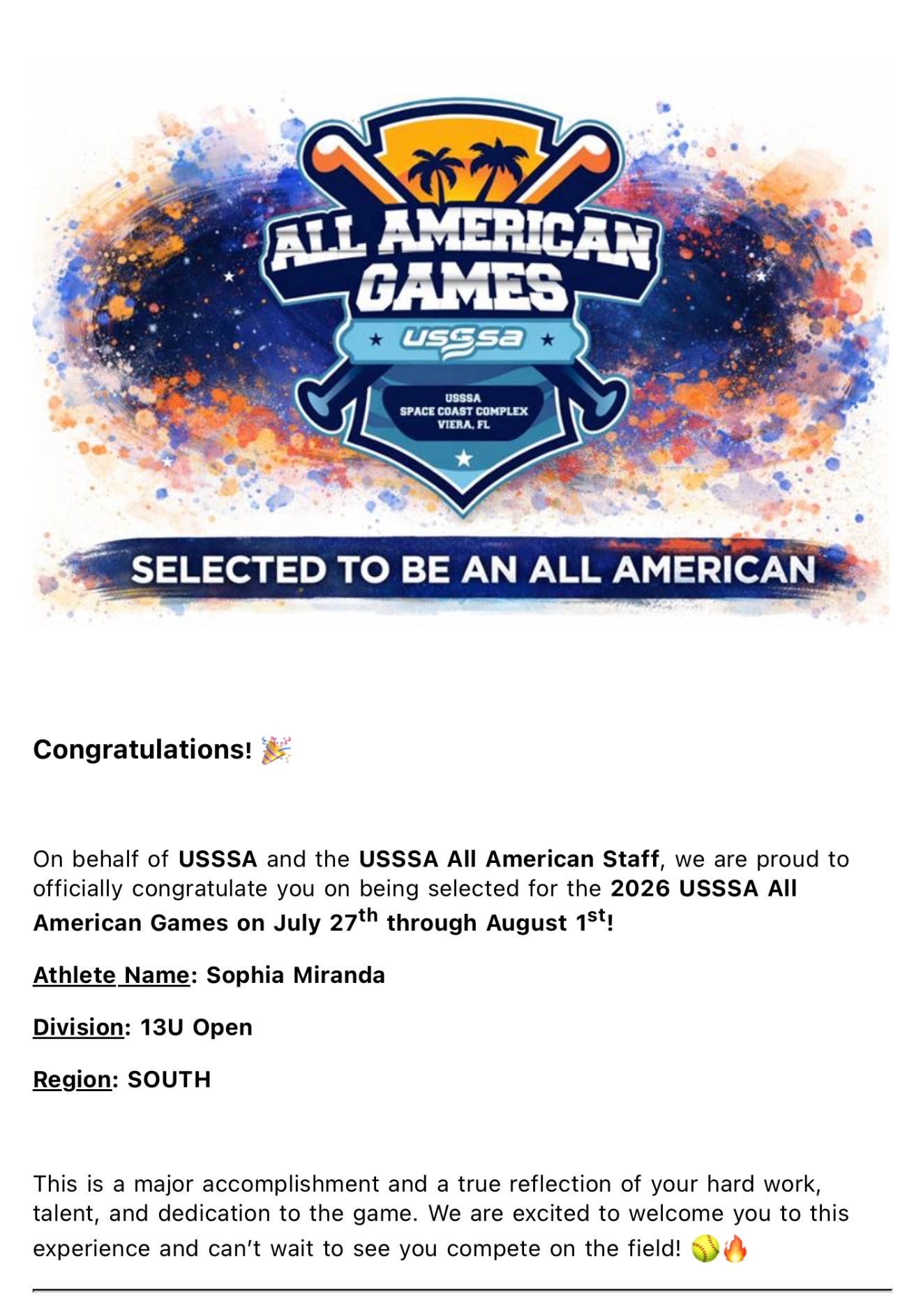 Sophia has worked incredibly hard and was recently selected to participate in the 2026 USSSA All American Games in Viera, Florida, from July 27th through August 1st. This is a huge honor and a dream come true for her, as she will have the chance to compete with talented athletes from across the country. We are so proud of her dedication and the effort she put into making this team.