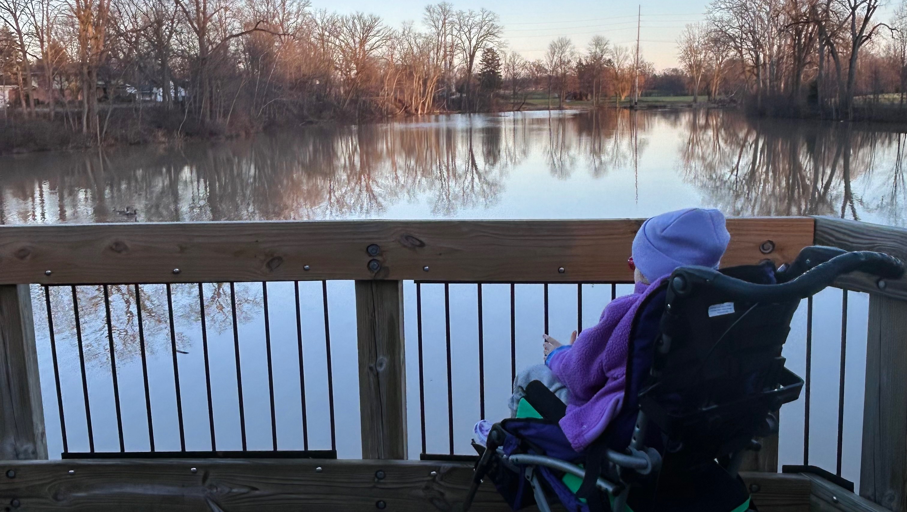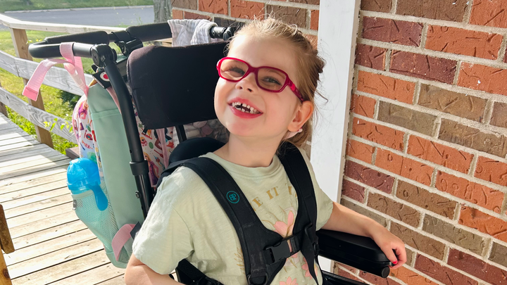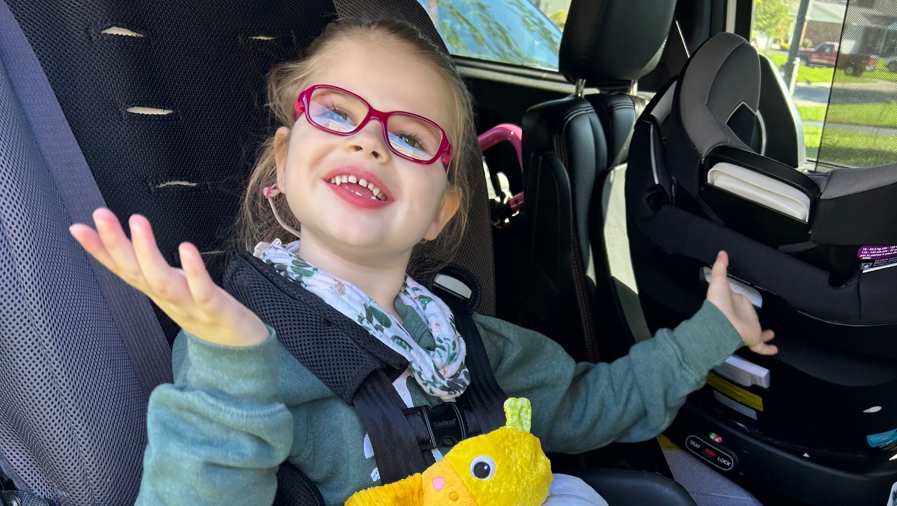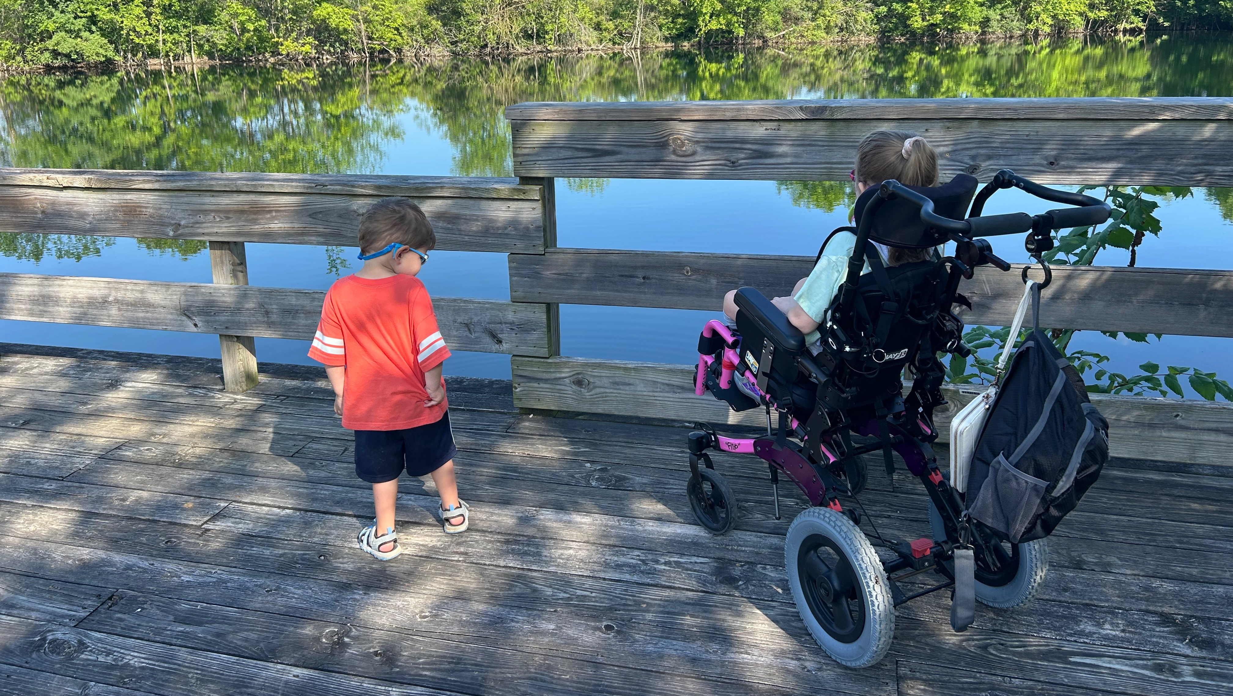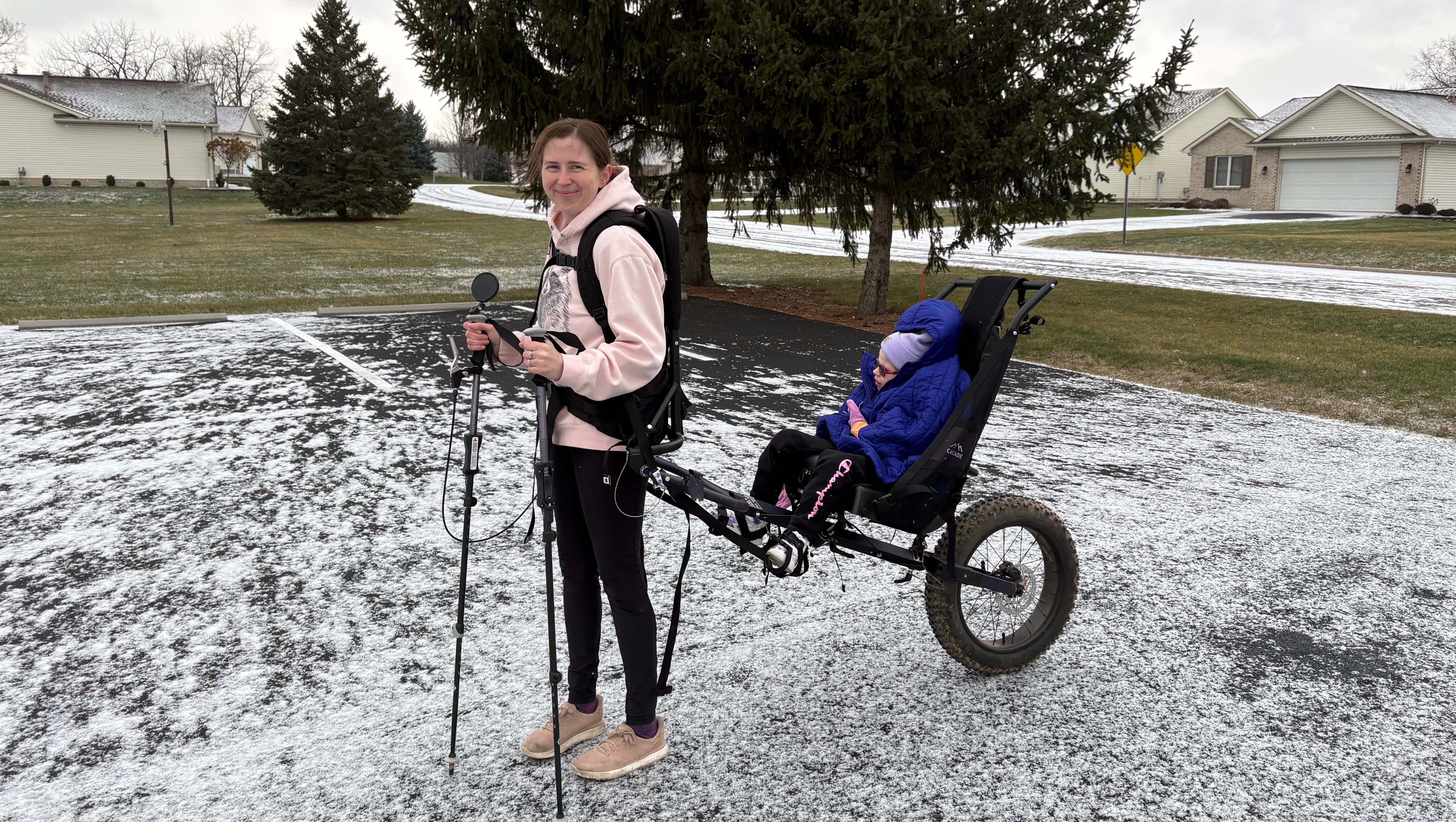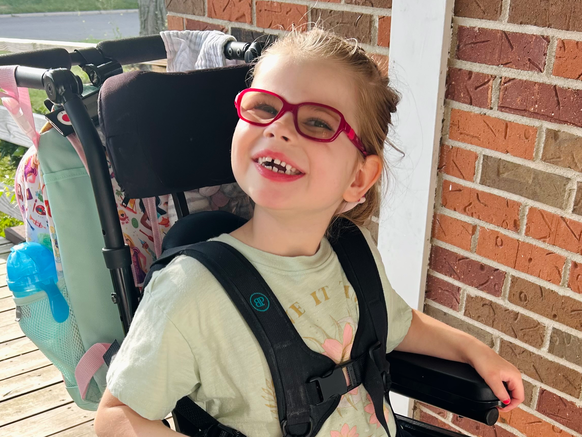 When she was younger we were able to carry her in a pack on our backs but now at 6 years old and 50lbs, it is not doable for us or her. We also used to be able to use a wagon to do some very flat paths but as she’s gotten older, she needs more lateral support than a wagon can give. She loves going to parks and being outside.