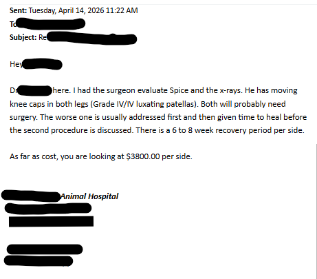 After bringing him home, I noticed he was walking strangely and seemed to be in pain, especially after playing. I took him to the vet, and the news was heartbreaking. Spice has two old fractures (one in each leg) and both of his knees are dislocated. His kneecaps are not where they should be, which is causing him ongoing pain and instability.