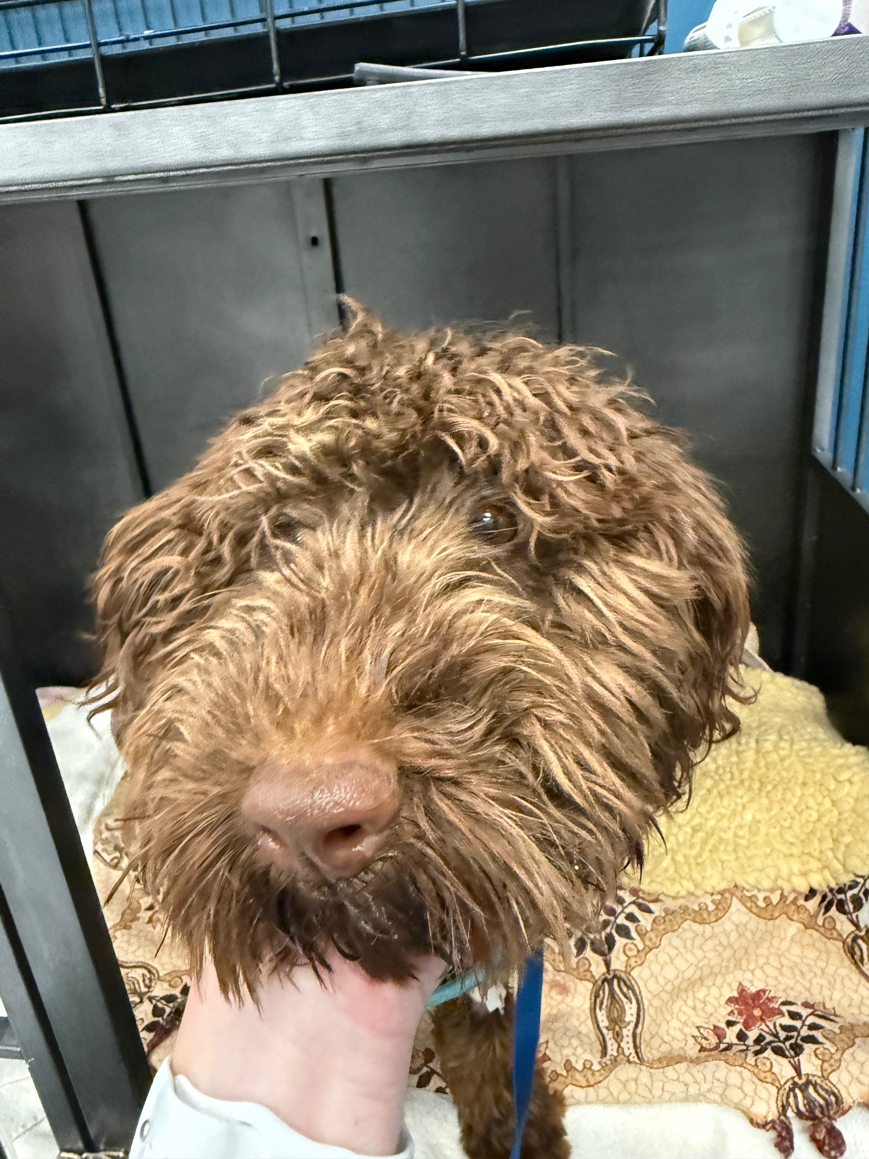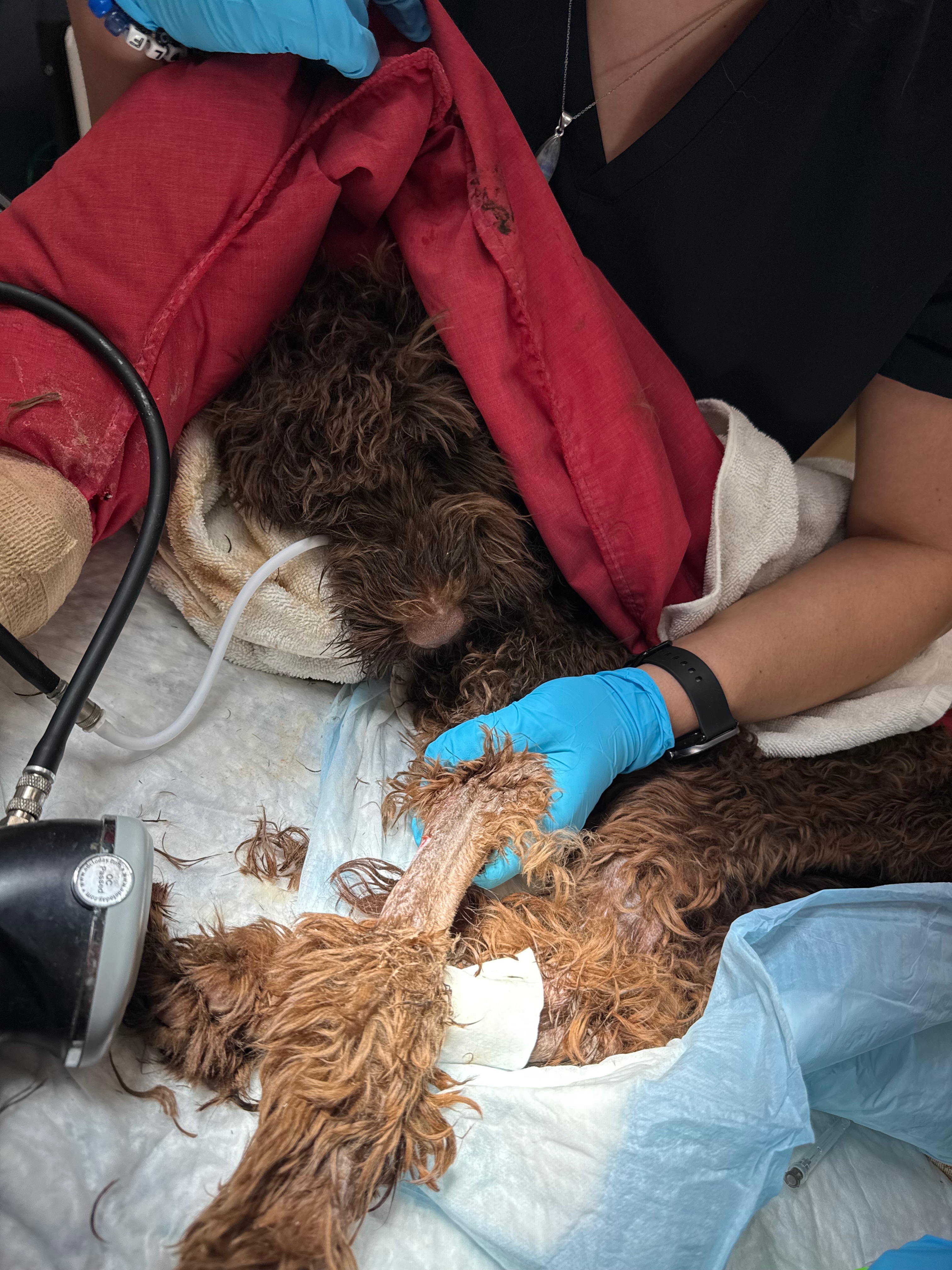 Please help us save Stormie! The sweet 7 month old female labradoodle was brought into see us on the ER floor by a Good Samaritan who rescued her from severe neglect. She was found soaking wet in a small crate outside and in the rain, going days without food. Her guardian angel begged her previous owners to surrender Stormie to him so that he could seek veterinary care for her. They asked a high price for her, and he paid it. Unfortunately, Stormie was so sick on presentation that her rescuer could not afford further intervention for her, so he then surrendered her to us to help save her. Stormie was severely emaciated, hypothermic and in shock when she came in to us. She had pressure sores on all of her legs from spending likely her entire life in a crate. She is requiring treatment in hospital with aggressive supportive care and medications to monitor her while she recovers. She has a long road ahead but she has already shown us that she is a fighter! Please help us support this sweet girl and give her a second chance at life. If you or anyone you know might be interested in fostering or adopting Stormie, please reach out!