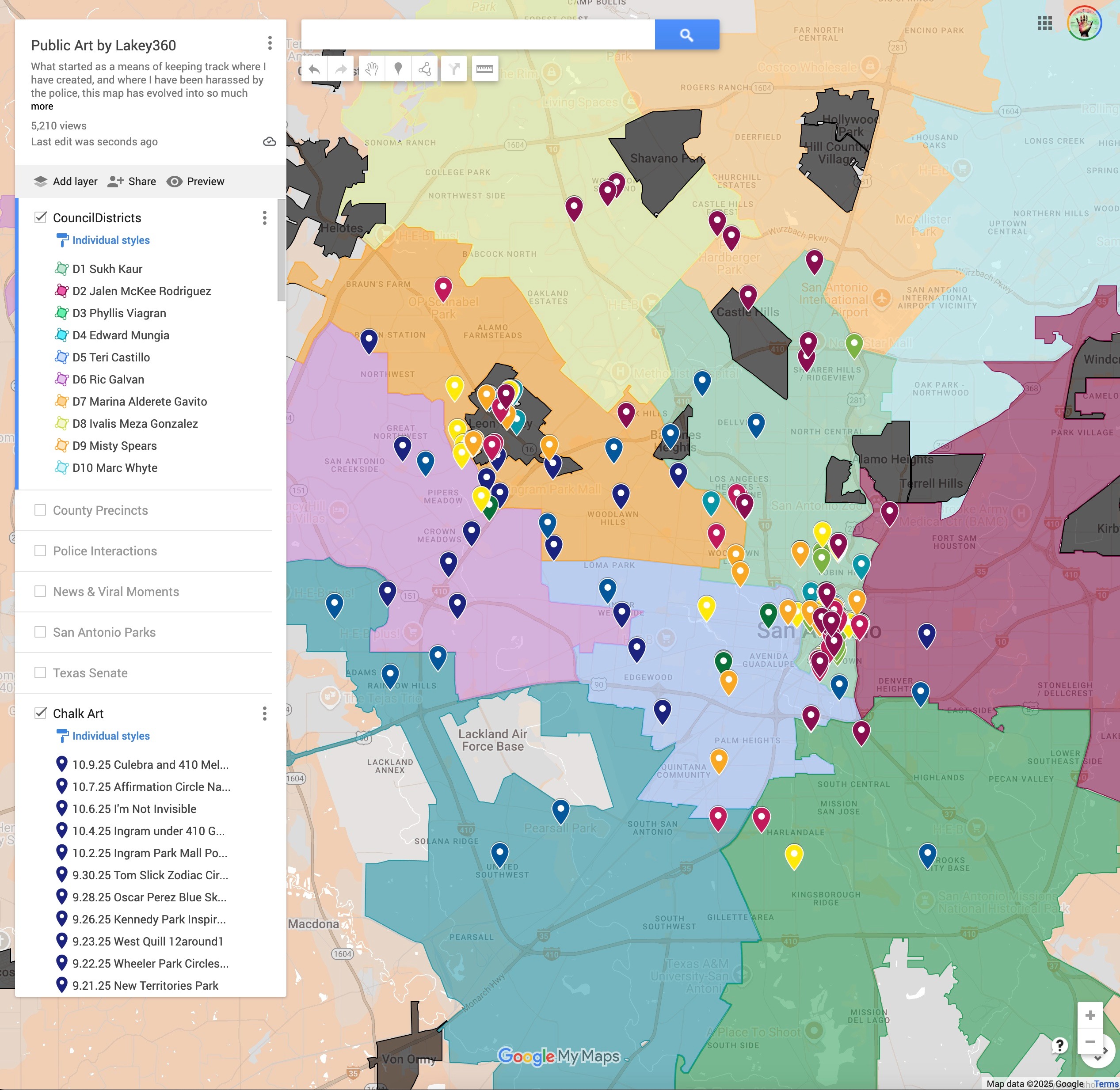I have been accused of using sidewalk chalk in HOPES of having the police harass me for social media content. Meanwhile I have been a public artist since 2012. Police all over the country have tried to intimidate freedom of expression of artists for as far back as anyone can remember. It wasn't until 2019 I started standing up for myself to the point they arrested me. In 2023 I got brave enough to start pulling out my camera when they harass me. Since then I have been arrested twice and ticketed 6 additional times. Charges dropped every single time. The map includes dates and locations for these issues. I even went in and added the council districts and county precincts. Nowadays I write that information by each art piece to help myself and community become more aware of who our elected officials are.