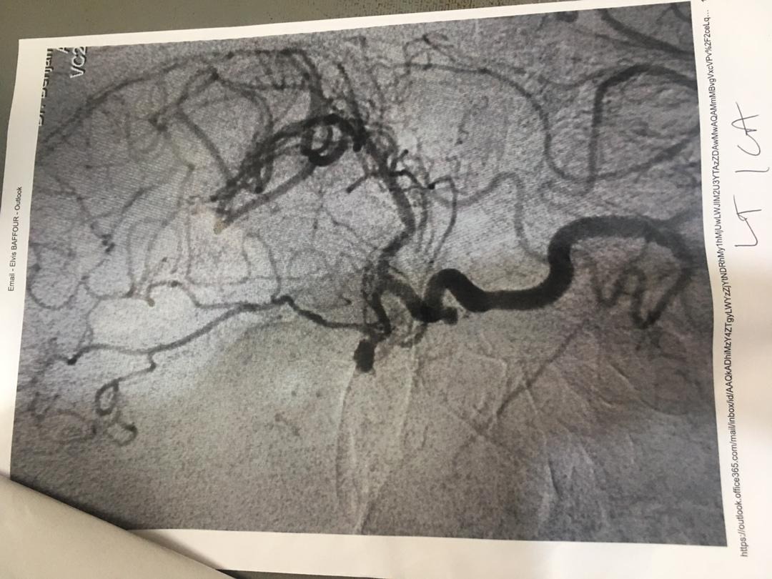 Attached is a copy of her medical scan report (2023) from Euracare Advanced Diagnostics and Heart Centre, Accra, confirming her diagnosis and the recommendation for urgent endovascular coiling.