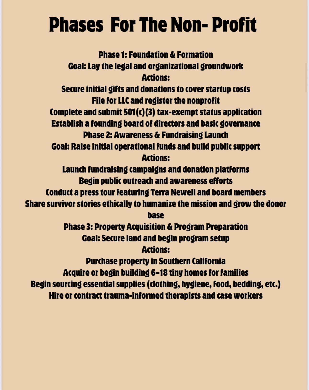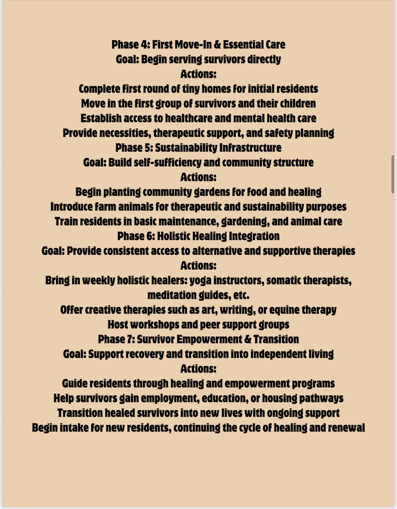 Our vision includes developing a self-sustaining haven featuring 6 to 18 private tiny homes, offering families the privacy and security essential for healing. The community will provide holistic support services, including weekly therapy sessions, access to necessities and supplies, nutritious food, and programs to assist in transitioning back into society. By fostering an environment of compassion and resilience, we strive to empower survivors to reclaim their independence and create new beginnings. This is to raise money to apply for our 501c3