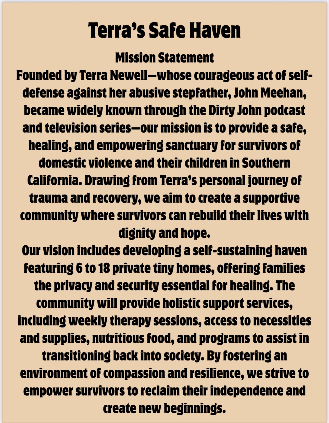 Founded by Terra Newell-whose courageous act of self-defense against her abusive stepfather, John Meehan, became widely known through the Dirty John podcast and television series-our mission is to provide a safe, healing, and empowering sanctuary for survivors of domestic violence and their children in Southern California. Drawing from Terra's personal journey of trauma and recovery, we aim to create a supportive community where survivors can rebuild their lives with dignity and hope.