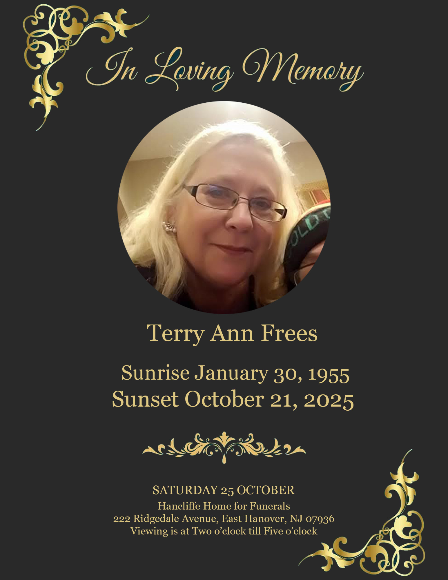 A Viewing will be held this Saturday October 25th at 2pm - 5pm at Hancliffe Home for Funerals 222 Ridgedale Ave, East Hanover, NJ 07936
