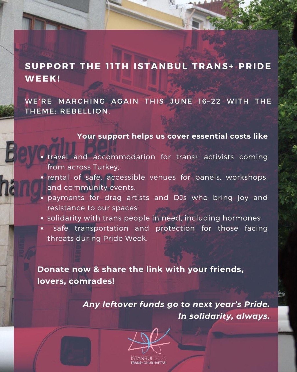 Now, We ask for everyone's support for our expenses during Istanbul Trans+ Pride Week, which is organized in collective solidarity. Especially this year, due to the increasingly difficult economic conditions and state repressions, our budget is very limited and we struggle to provide this important week with all its workshops and events to our community.