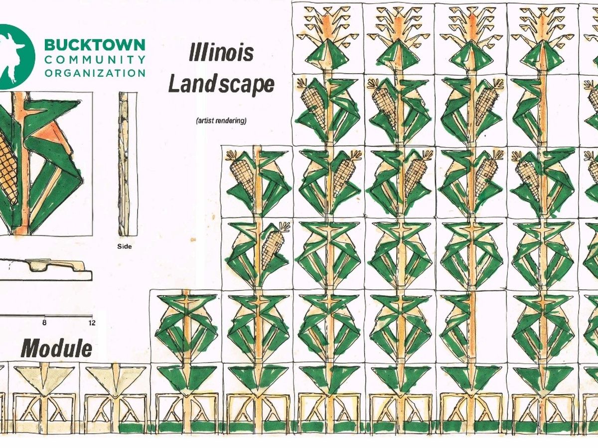 The estimated 10’x90’ canvas of "Illinois Landscape" by Sam Marts envisions individual corn plants framed in a graphic grid. Corn has long been a foundation of the Illinois economy and an iconic landscape image of Illinois. The expressions, “Knee High” by the fourth of July or as “High as an Elephants Eye,” remain measures of the prosperity of our world. Besides corn being in almost everything we eat, corn is why railroads radiate from Chicago, and corn is why the Board of Trade exists. The rectangular panels will recall the decorative terracotta tiles that adorned many Chicago buildings while the repetitious, horizontal elements of the mural will complement the building's architecture. “Illinois Landscape” will tower above a person standing by the mural and relaxing at the Bucktown Green, encouraging one to be a child again, getting lost in a cornfield.