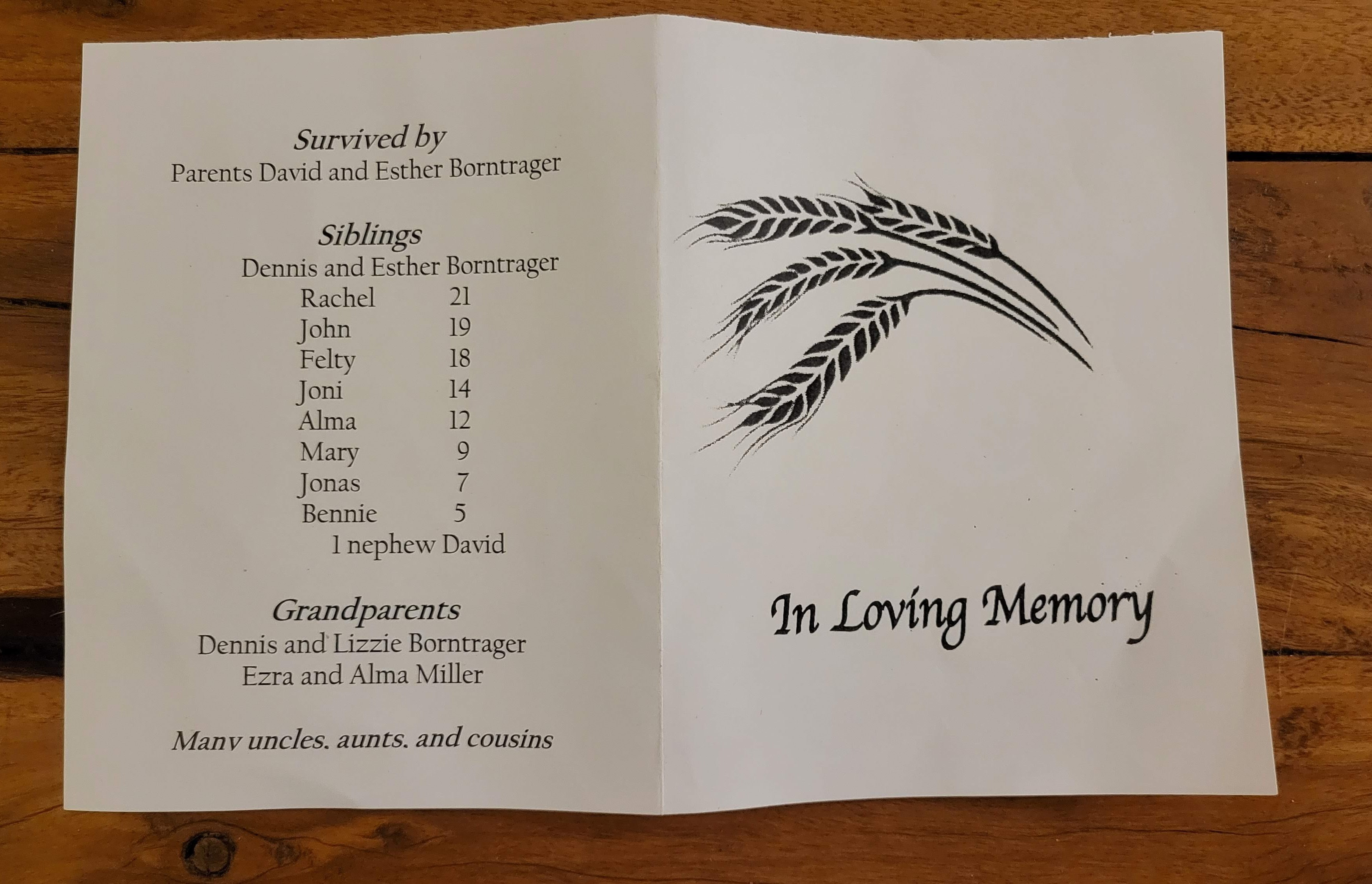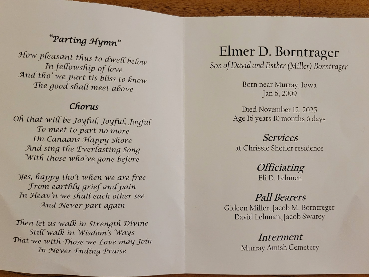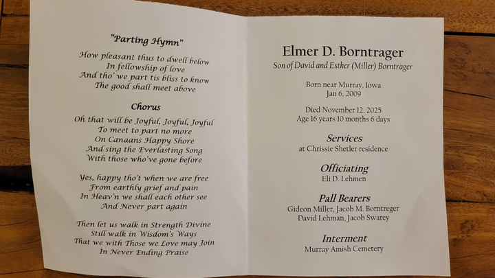 Elmer D. Borntrager, 16 years of age, was tragically killed in a hit-and-run accident while driving his horse-drawn buggy on November 12, 2025. The crash took place near Murray, Iowa, in Clarke County on R-15 near Forest Street. Elmer was hit from behind by a northbound vehicle and thrown from the buggy. The driver of the vehicle fled the accident. Elmer was pronounced dead at the scene of the accident. The horse was injured but survived the accident. Funeral services were held for Elmer on Sunday, November 16th. He is survived by his parents, David and Esther Borntrager, and his siblings.
