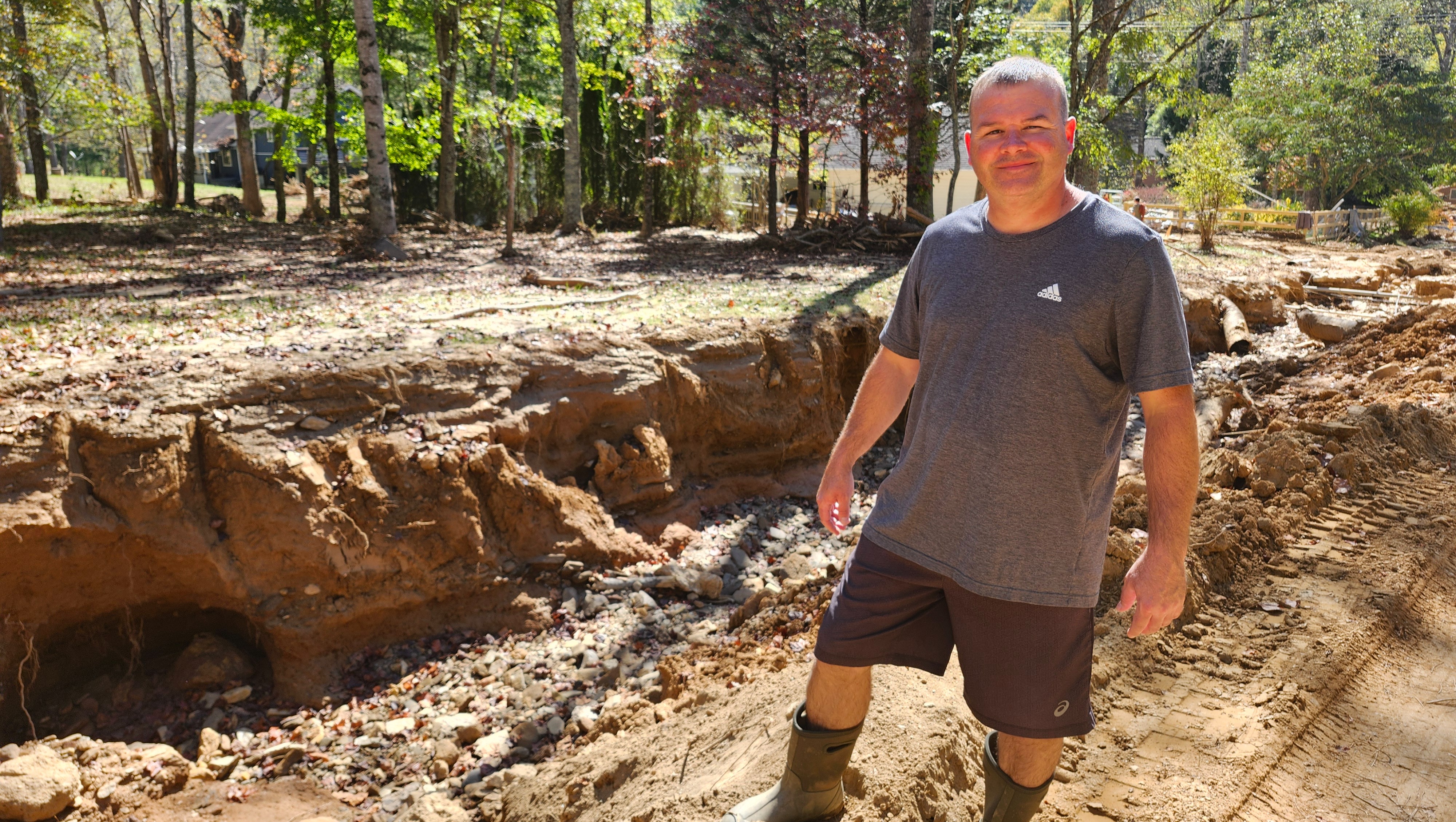 On Friday, September 27th, we lost power in the early morning hours due to the hurricane, wind, and rain. That morning, Shane went outside to get some solar lights out of the driveway and was greeted with what he said was a 10-foot tidal wave of mud, boulders, and uprooted trees. He told me he saw our neighbor's mailbox shoot out of the road and ran as fast as he could. He ran fast inside, and we screamed as we saw our cars move and float away and our yard turn into a lake of logs and debris, and in an instant, it stopped. We prayed and thanked God for watching over us and prayed for His continued protection. After the hurricane, we lost our entire road, our driveway is used for the neighborhood, our cars, and had a mudslide hit our garage pretty bad, but by the grace of God, we are alive and safe.