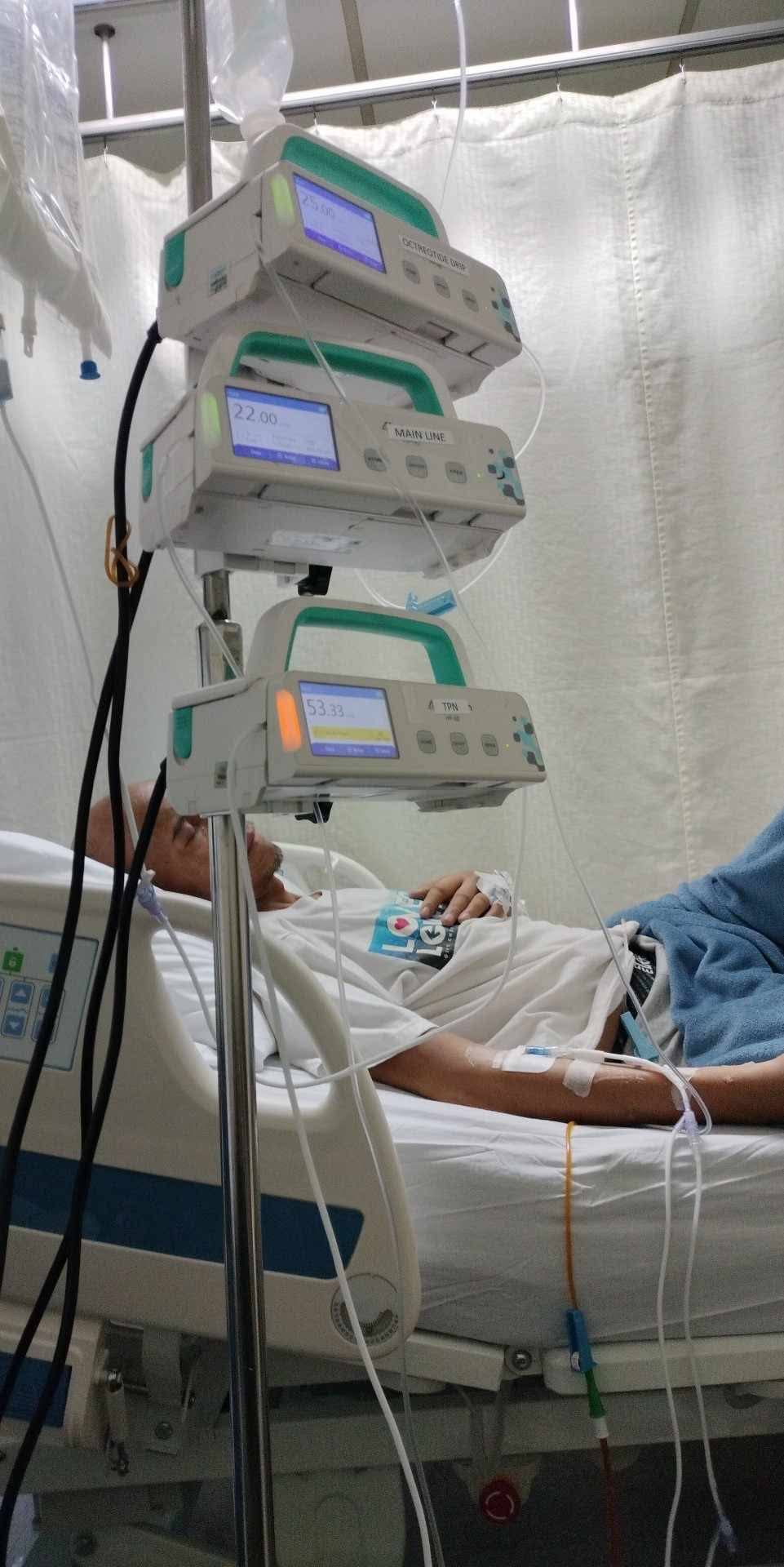 Tito Jun was admitted into the hospital earlier this year, but has been readmitted to the hospital for over a month now— since April 18, 2025. He has already had several blood transfusions, and the pancreatic tumor has blocked his bile ducts and digestive tract, leaving him unable to eat. He now relies on a nasogastric tube (NGT) for nutrition, an external drain for his bile, and a central line to directly provide extra nutrients into his bloodstream for his weakening body. He has lost significant amount of weight.