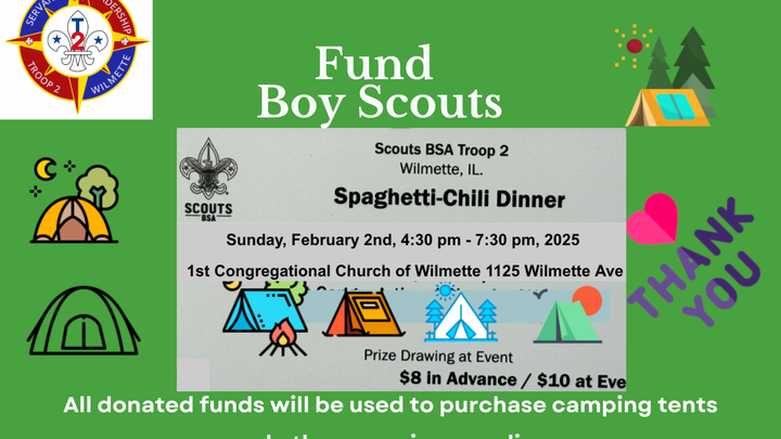 Your support enables Troop 2 to continue providing such transformative experiences to young scouts like me. The purpose of this initiative is to raise funds for the refurbishment of old camping tents and facilities, ensuring improved conditions for our upcoming camping trips. I am here offering tickets for a spaghetti and chili dinner priced at $8 each. Your attendance at the spaghetti and chili dinner is not mandatory, but your generous donation, ranging from one cent to one hundred dollars, would greatly contribute to our cause.