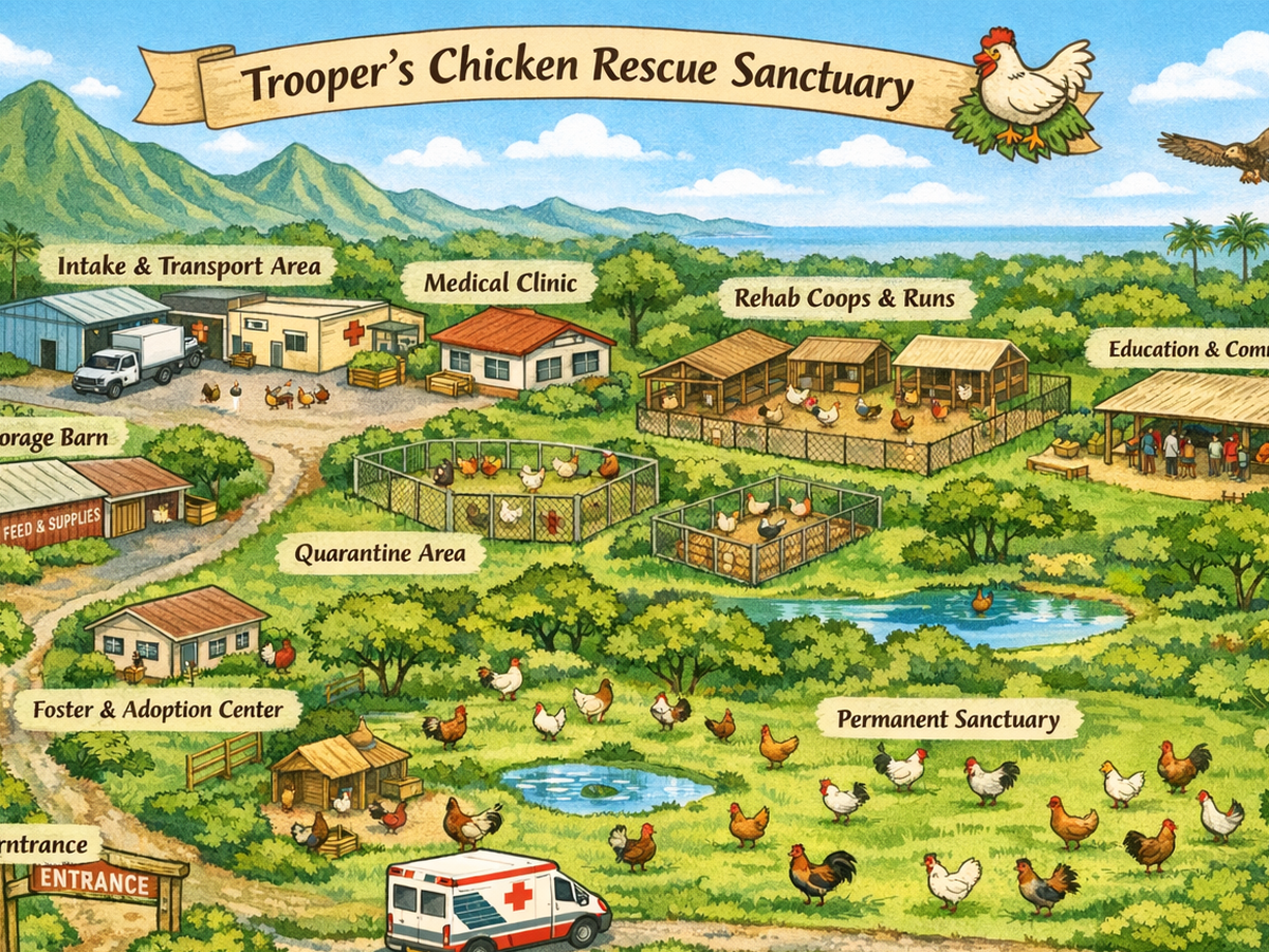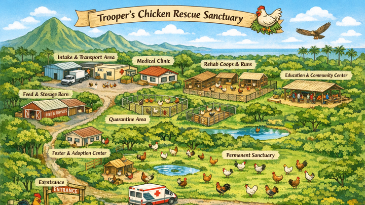 Our goal is to raise $4 million to build Hawaiʻi’s first dedicated chicken rescue and rehabilitation sanctuary. This funding will allow Trooper’s Chicken Rescue to purchase land, build safe housing and medical facilities for rescued birds, and establish the transportation infrastructure needed to respond to large scale rescues.