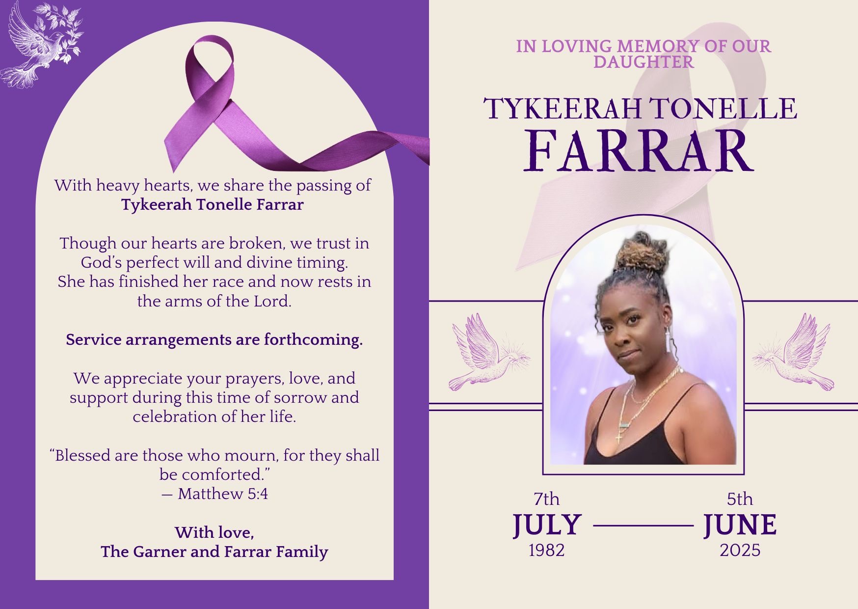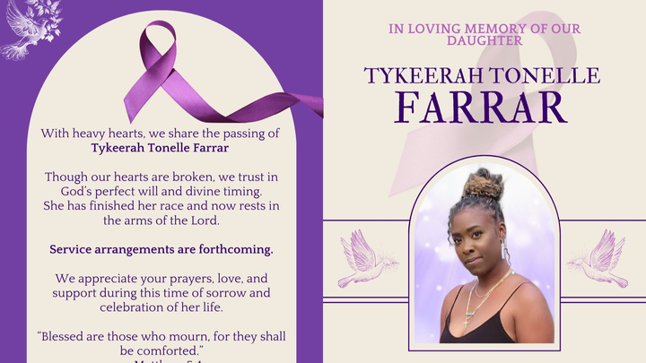 My name is Clarissa and I am the sister of Tykeerah Farrar. On June 5, 2025 our beloved transitioned after a courageous battle with pancreatic cancer. She was a devoted mother, daughter, sister, and friend whose light touched everyone around her. Her faith, strength, and love never wavered, even in the face of unimaginable pain.