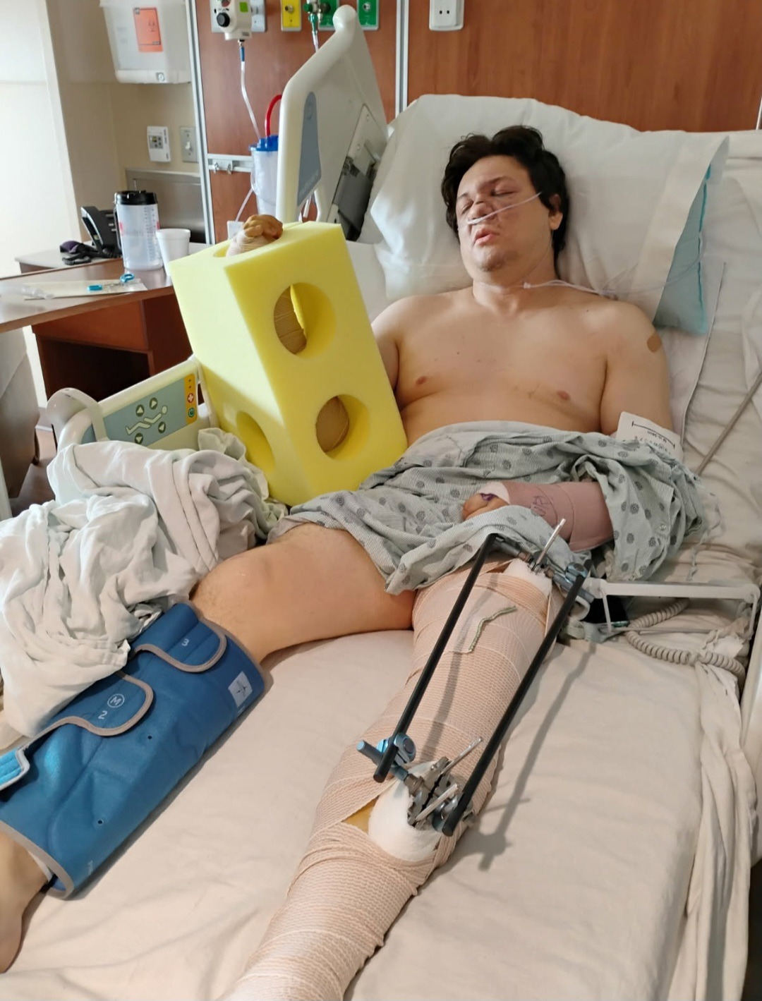 Tyler So was in an extremely bad motorcycle wreck. He has multiple broken bones: two broken legs, a two broken arms and hands, shattered facial bones, and a shattered kneecap. It's going to be a very long process for him to heal and require multiple surgeries. He will have to learn how to walk again.