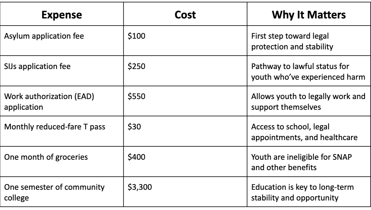 Immigration application fees are expensive — and because these youth are not immediately allowed to work, they cannot raise these funds themselves. It often takes six months just to apply for a work card, which comes with a $550 application fee. Until then, even essentials like groceries and public transportation are often out of reach.