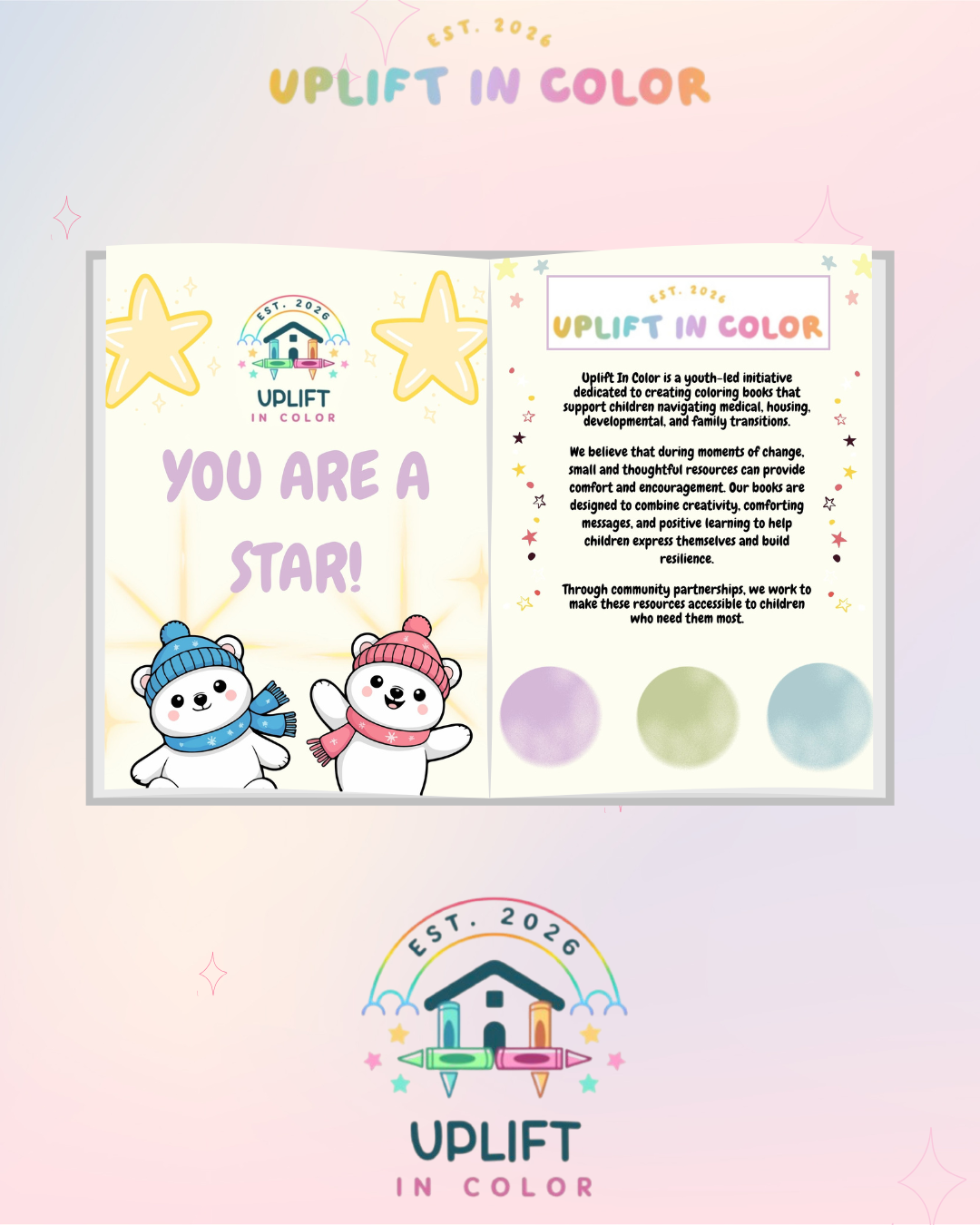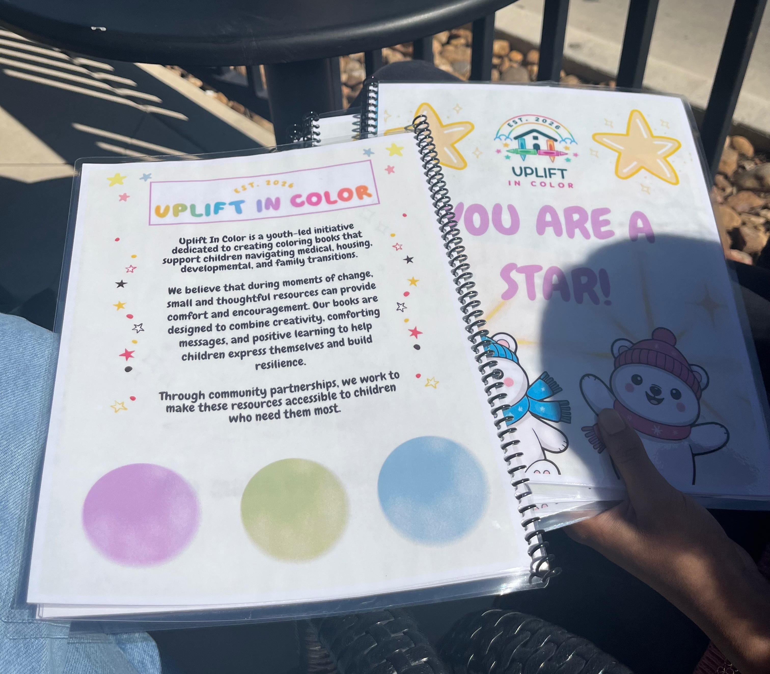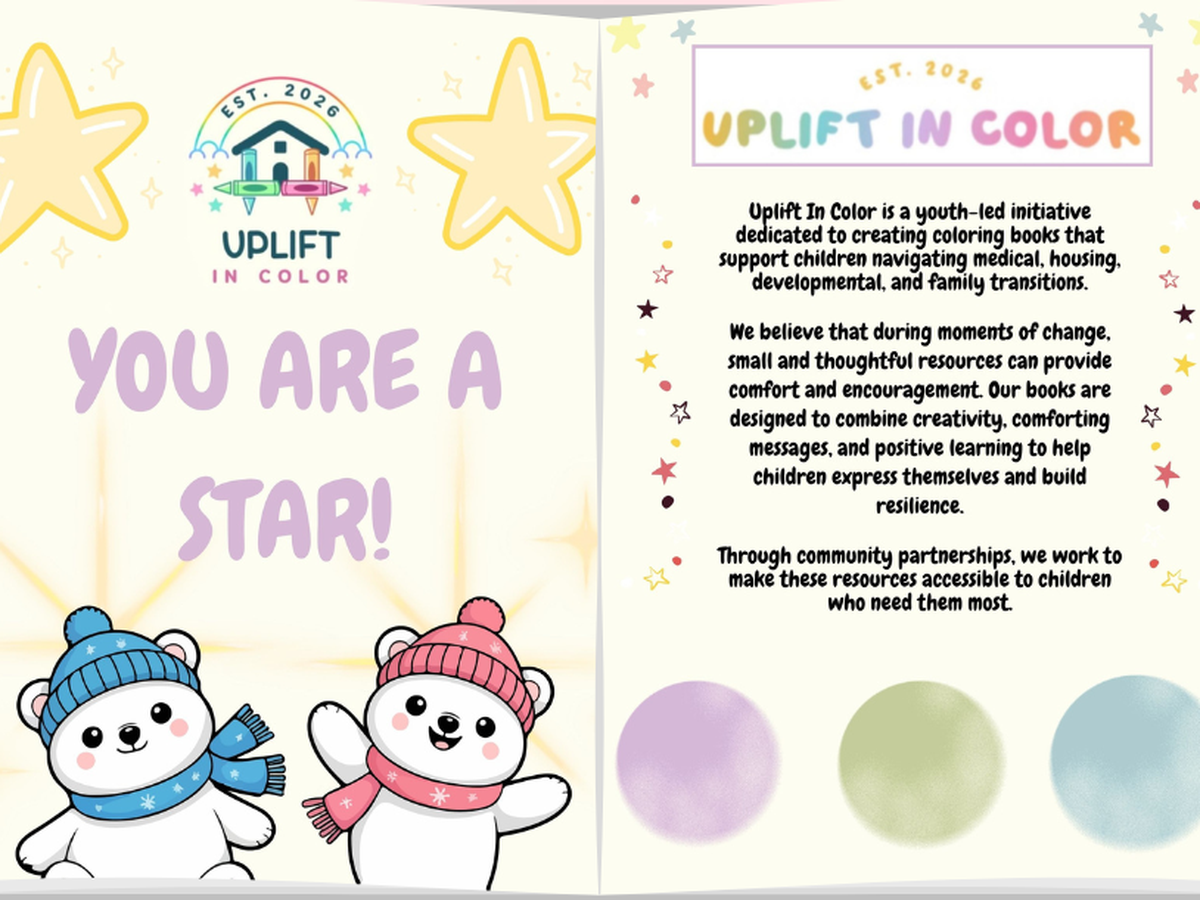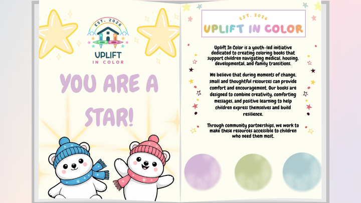 Uplift In Color is a youth-led nonprofit dedicated to supporting children as they navigate medical, housing, developmental, and family transitions. Our mission is to provide creative resources that encourage comfort, self-expression, and emotional resilience during periods of change. We design positive and educational coloring books with handwritten cards to help children process different experiences in a supportive way. Our goal is to make these resources accessible to children in need through community partnerships and free distribution. We strive to combine creativity and compassion into tools that promote growth and well-being during early life changes.