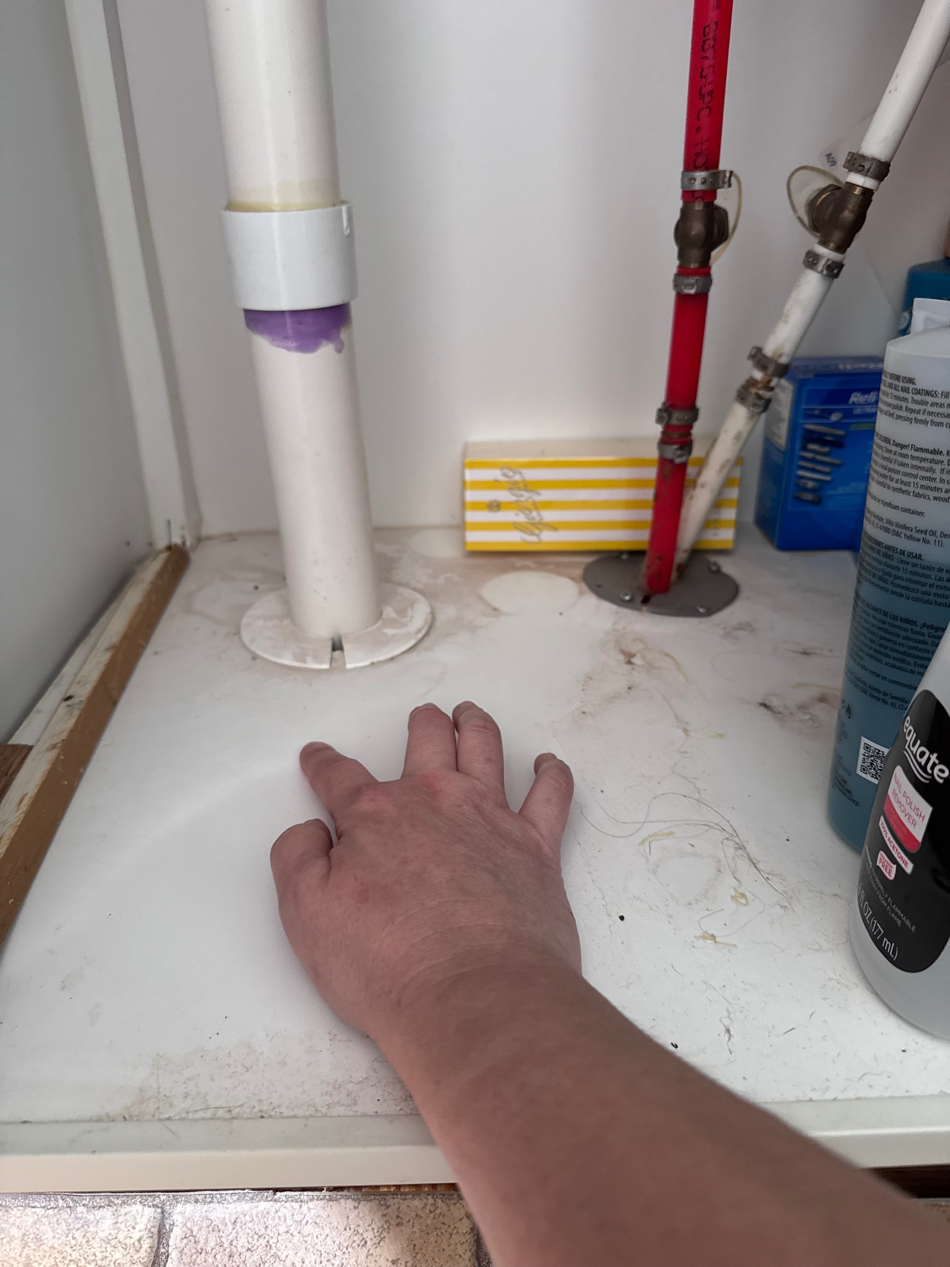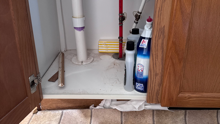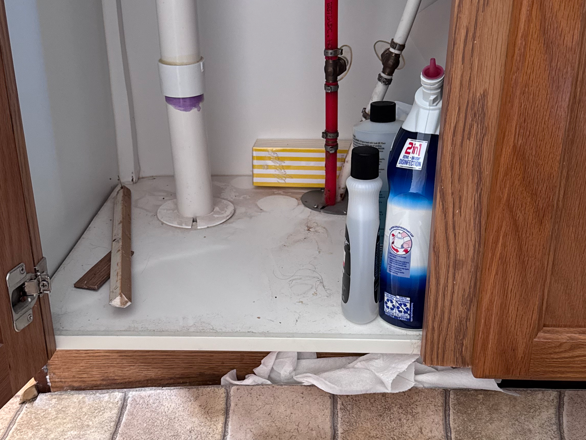 Yesterday, after checking on some stray kittens and leaving food for them, we came home and I noticed a box near the vanity in our master bathroom was wet. That’s when I saw the vanity itself had warped and swollen from water damage. After removing everything from underneath, the inside of the cabinet appeared dry, but we still cannot locate the source of the leak. I immediately shut off the water to the sinks, but we now need a plumber to find the leak. The cost to diagnose it alone is $650, not including any repairs or remediation. I have contacted our current insurance company, but we are waiting for a claim adjuster, with no clear timeline.