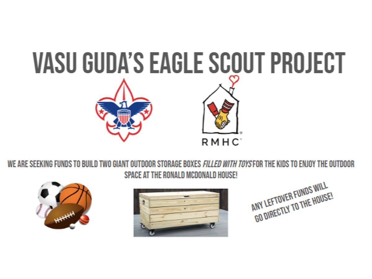 Hello! My name is Vasu Guda and I am currently working towards achieving my Eagle Scout Rank. Scouting has had a huge impact on my life- and its service projects like these that I've enjoyed the most and have found the most value in. For my final Eagle Scout Project, I am teaming up with the Ronald McDonald House Charities of Eastern Wisconsin to build something special that will hopefully make the stay even brighter for the kids.