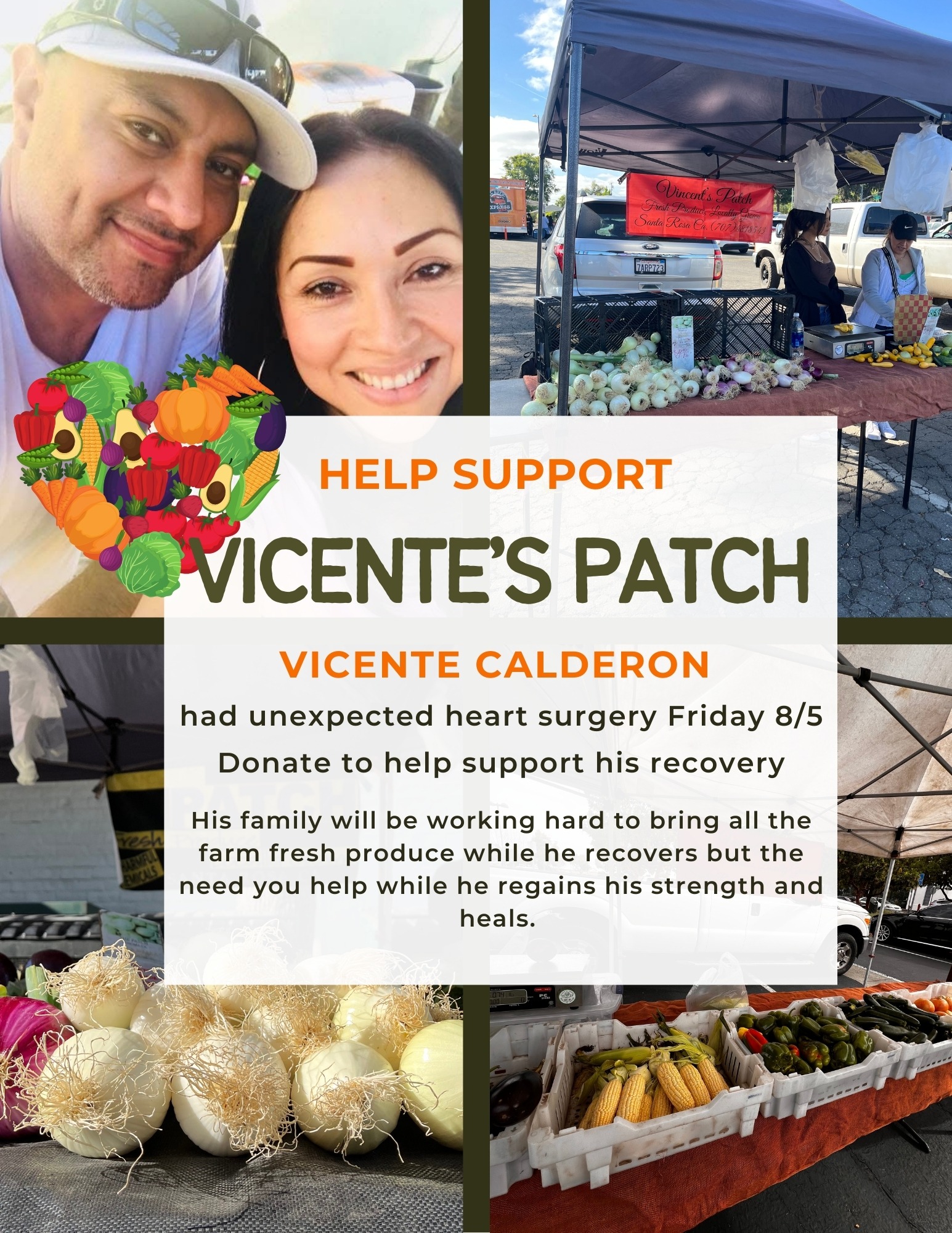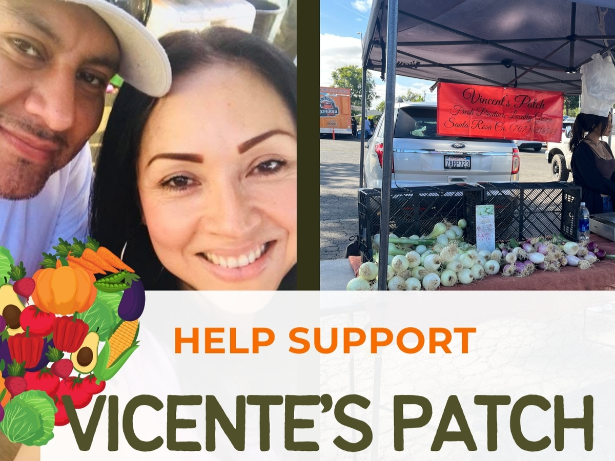 Vicente is the owner of Vicente's Patch, a small farm in Sonoma County. He sells his produce at local farmers markets. Currently his family is operating the farm and selling at markets but they are also spending a lot of time at the hospital to help support Vicente's recovery.