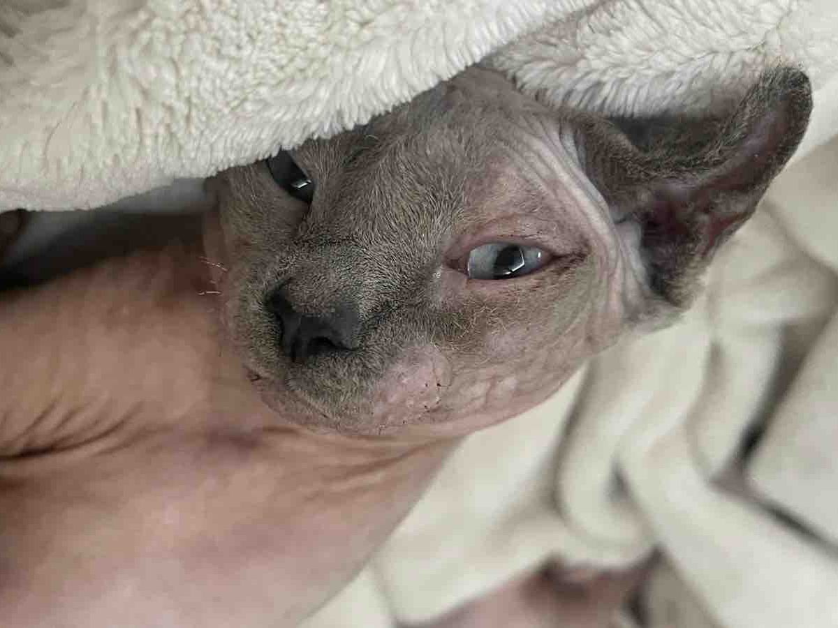 He didn’t know how to drink water, and had to be hand-fed sometimes to understand that his food, indeed, was his own! We nursed him back to health enough to gain his trust and to clear up one of his ear infections along with all of his sores and eye infection. Because he is a rescue AND because of his stunted growth, we're unsure exactly how old he is, but his Veterinarian estimates about 1 year as of now since he has started to gain the normal Sphynx cat brown staining to his teeth.
