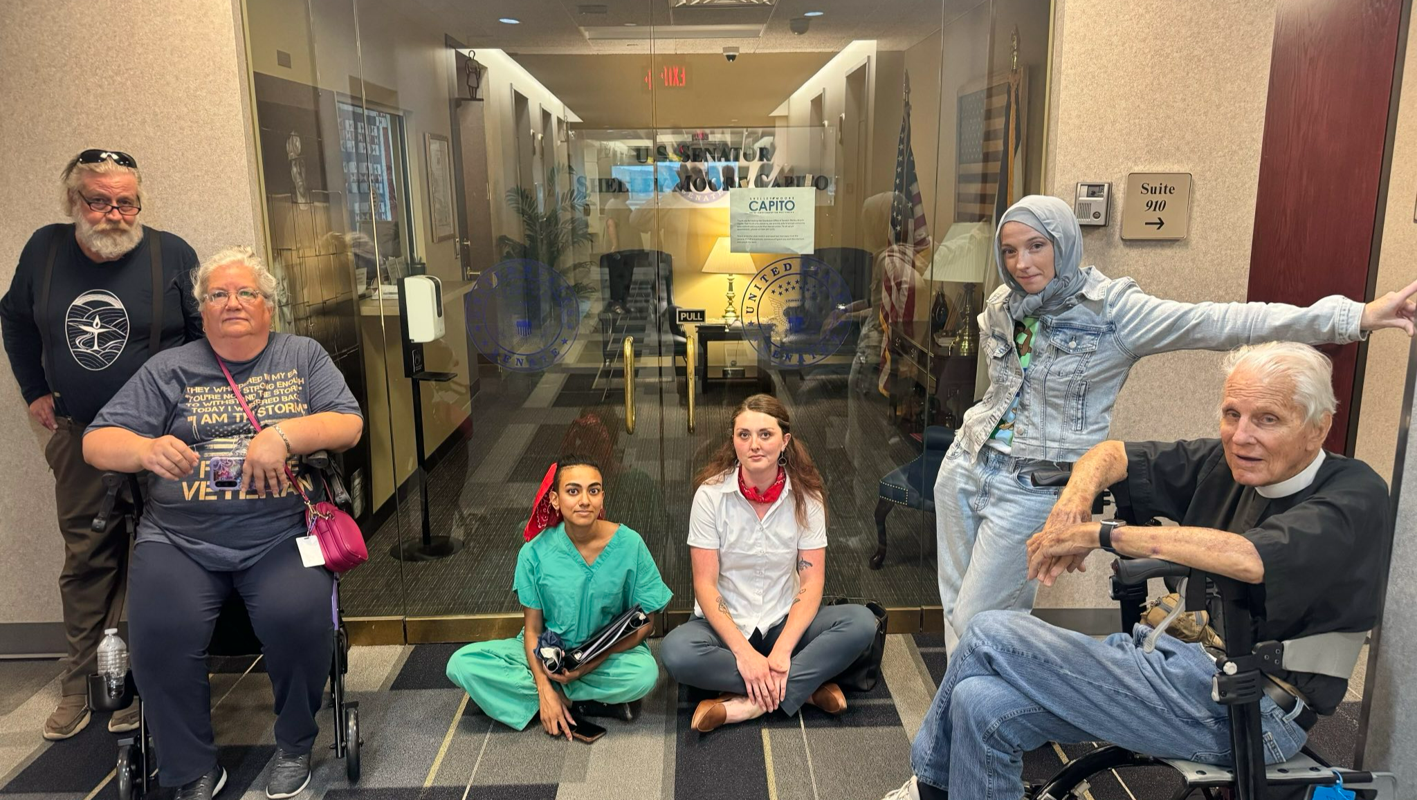 Six West Virginians - including faith leaders and Charleston city council members - were arrested in a non-violent protest at Senator Shelley Moore Capito's office, urging Senator Capito to vote "no" on the tax package currently moving through Congress, which would kick 75,000 West Virginians off their healthcare.