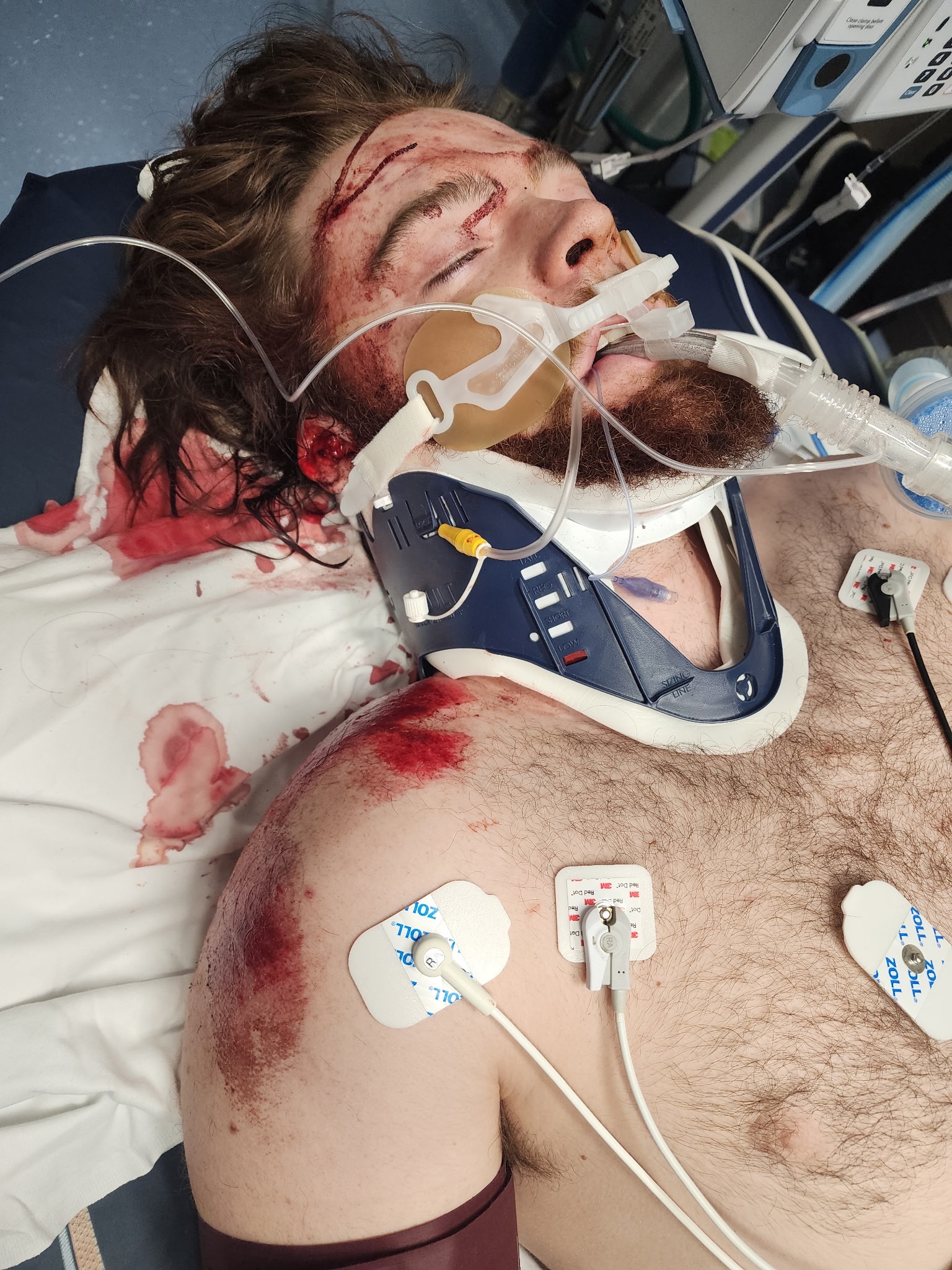 -Wyatt was unconscious & had to be intubated on scene. PRAISE GOD he started over-riding the machines & breathing on his own around 2 AM Sunday. We were able to get him off the ventilator completely on Monday. He is talking & alert, but we won't know the full extent of the brain injury for a while. Wyatt is extremely agitated & in a lot of pain, as he also suffers with a broken collar bone, right shoulder, left foot & 2 areas mid back. At this time, he does not require any surgeries. We were told today that upon his arrival to ER Sat, his scans showed a SSS blockage to the back of his brain, which is terminal. Clearly the PRAYERS are working, as he is still with us. When he can help cooperate a bit more, we will be getting another CT of that area. Wyatt has many months ahead of therapies.