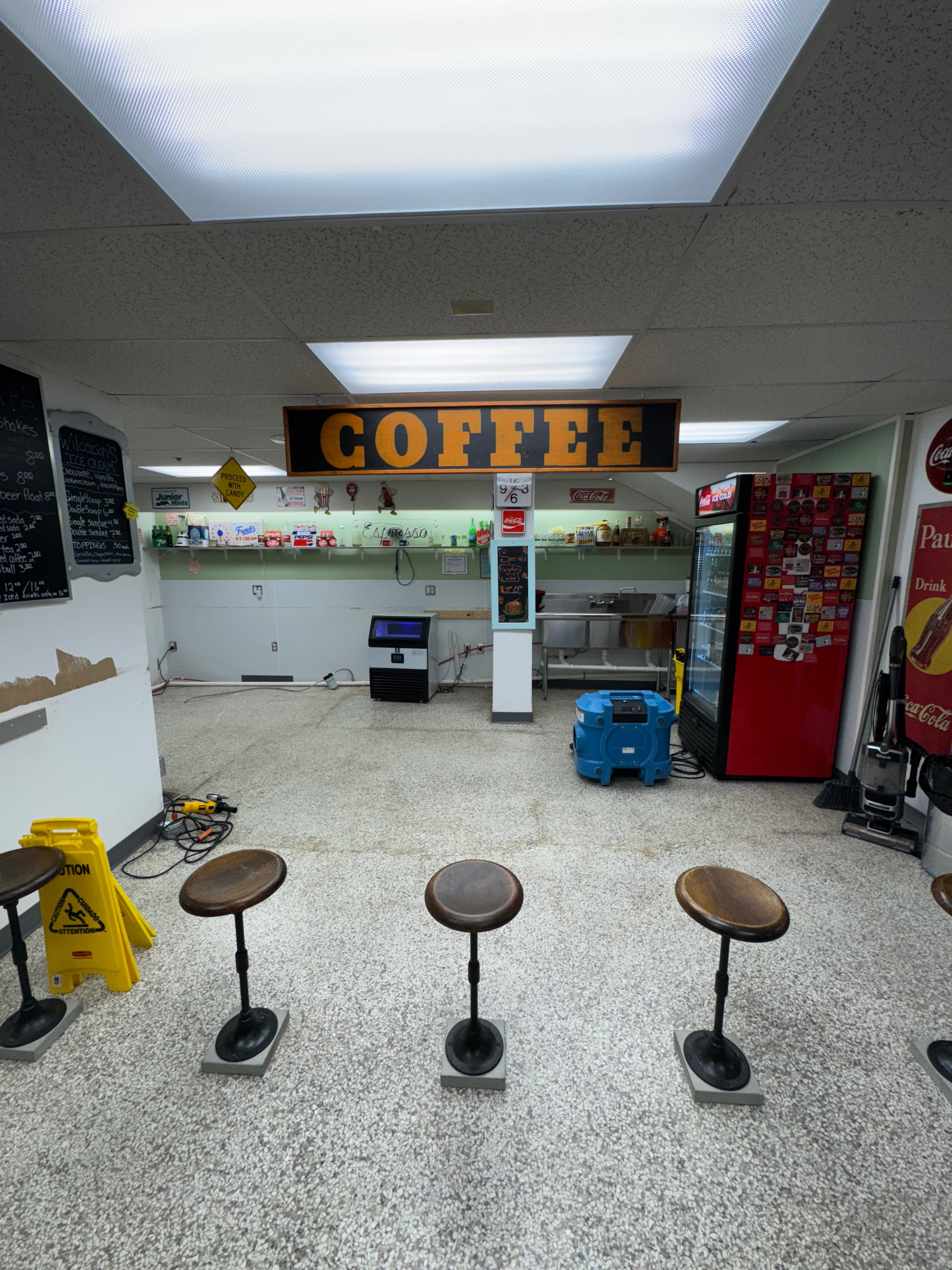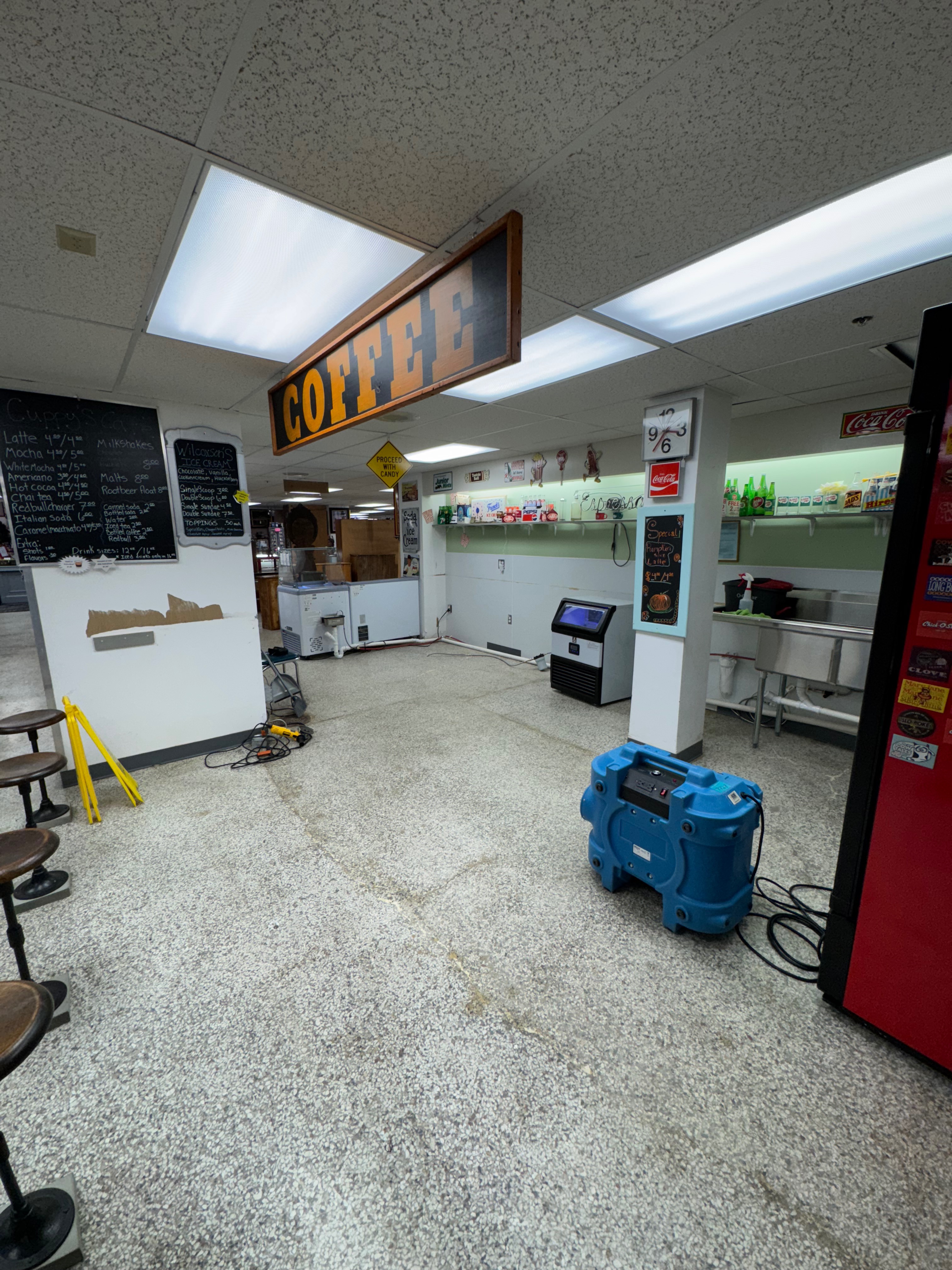 On Sunday the 12th, flood damage was discovered in several areas of the antique mall, with the most severe impact in the candy, popcorn, and coffee shop. Thankfully, Yesteryears has the support of our amazing landlords, who were able to get a restoration service in within hours of discovering the flooding.