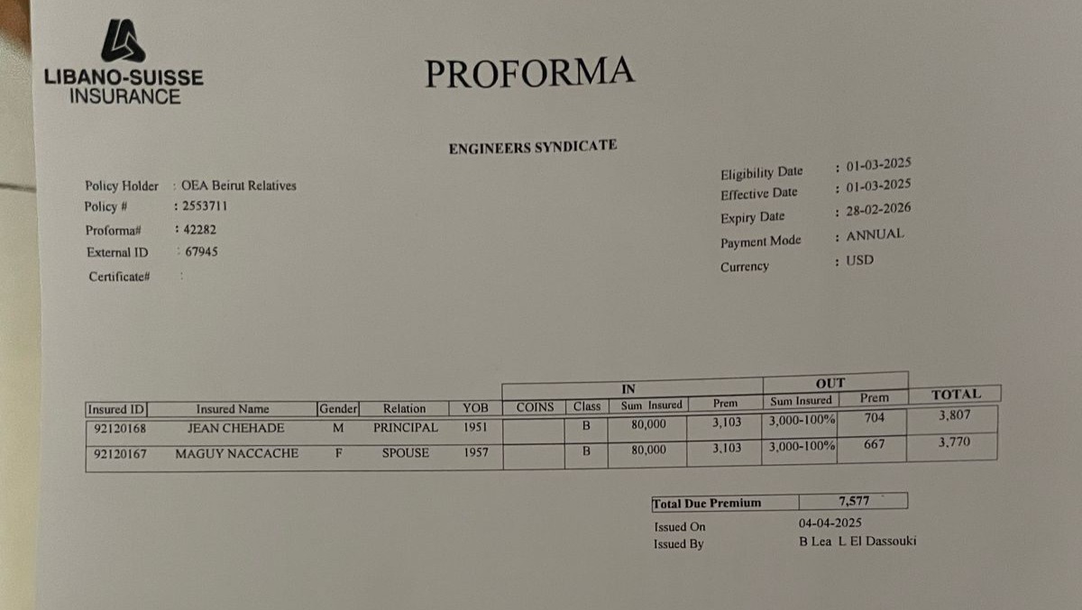 A proforma invoice from Libano-Suisse Insurance showing the annual premium of $7,577, which we need to pay to ensure her continued medical coverage.