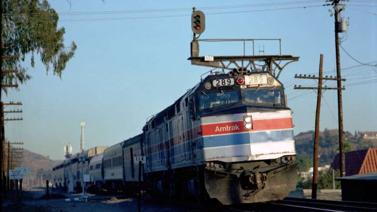 Amtrak's "Southwest Ltd." passes under the signal in Glendora, circa 1982.