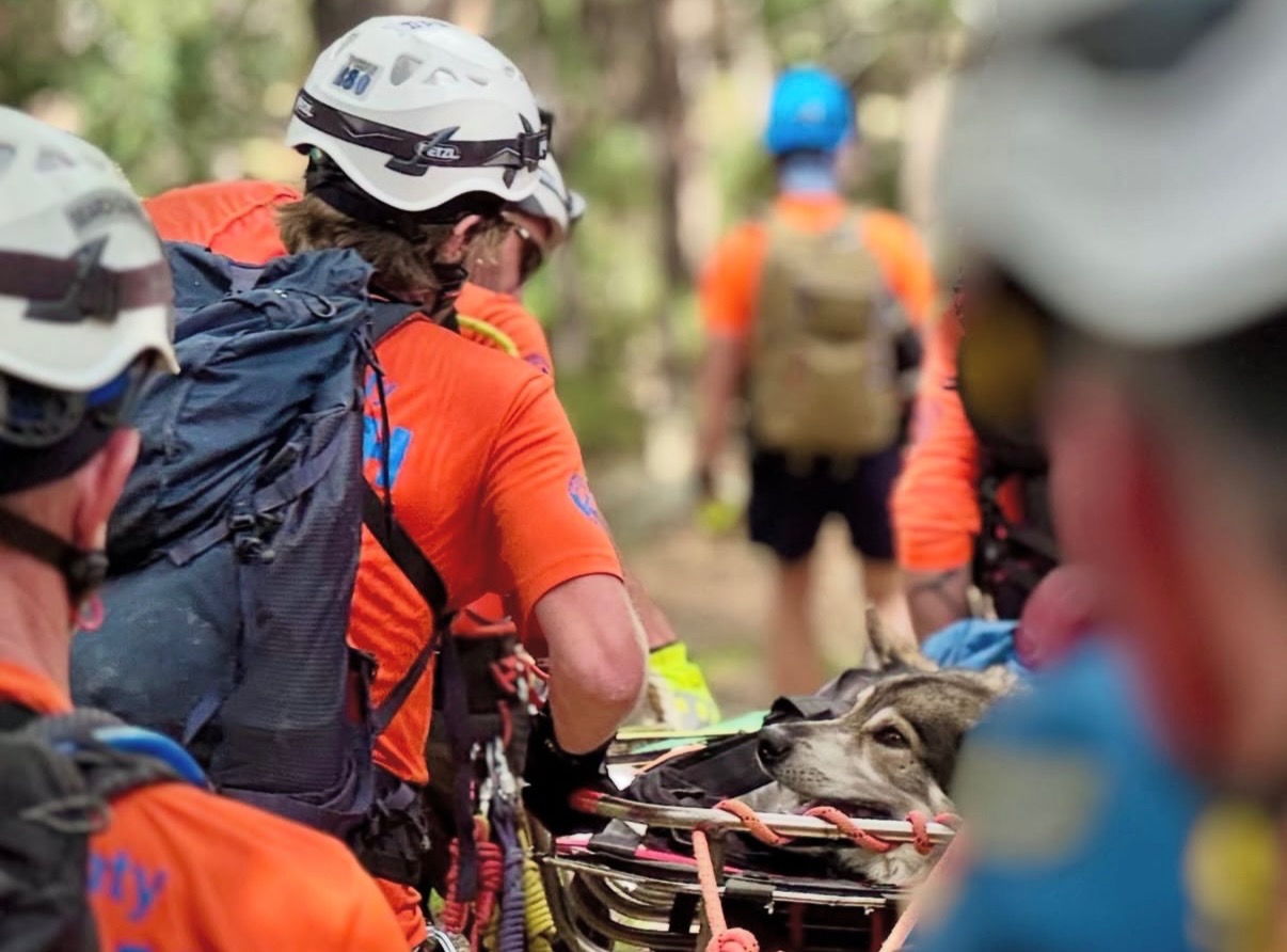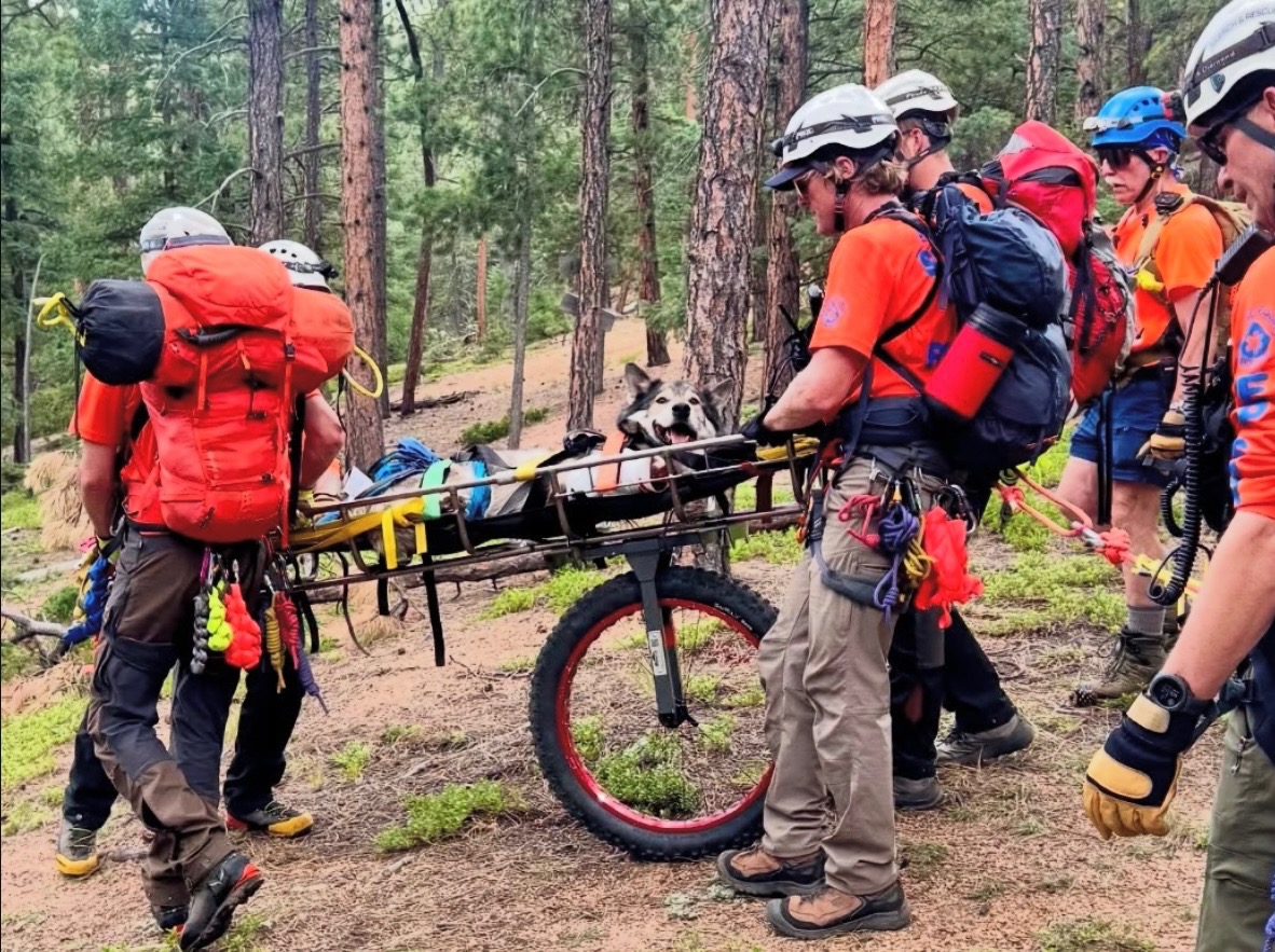 On 8/17, Whiskey was hurt in a terrible accident. This adventurous pup was enjoying a day at a local rock climbing spot when a rock slide was triggered. Poor Whiskey was in the direct path, unable to move fast enough before getting hit by a small boulder. It was quickly discovered that his front right paw was crushed on impact, causing an open fracture with arterial bleeding. His owner and friends rushed into action using the gear available to apply a tourniquet and wrap the wound, but bleeding still continued. He initially could not be safely moved, so El Paso Search and Rescue was called to safely extricate him. But when we were told it could be hours, four people ended up assisting Whiskey down the steep and now very loose approach as time was a critical factor with the amount of bleeding. Two partners were able to meet the group partway down and further assist with carrying him before eventually meeting with Search and Rescue. The El Paso team surprised us with a speedy response time and further stabilized Whiskey for his owner and friends to get him to the nearest emergency vet for treatment. We cannot thank the El Paso Search and Rescue team enough.
