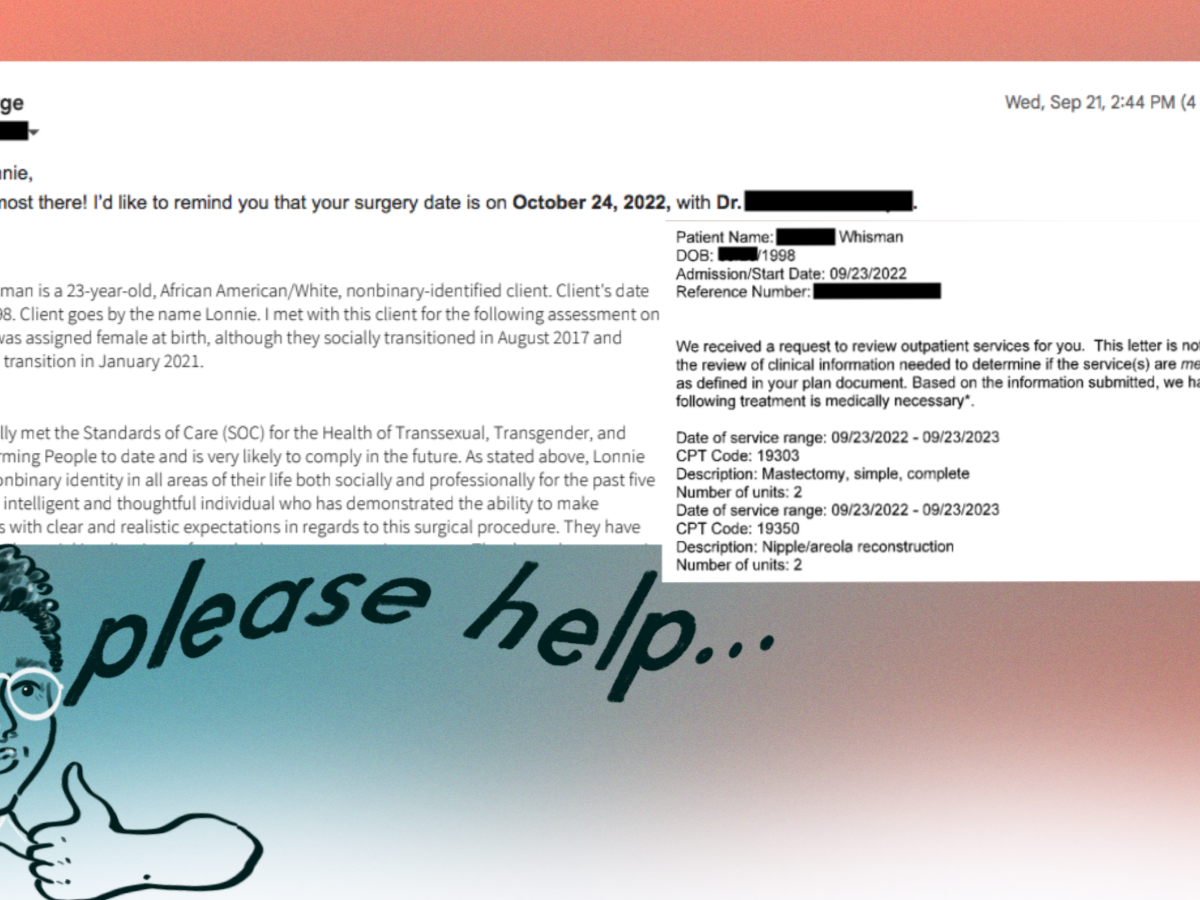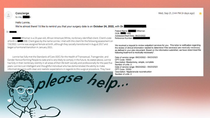 2: an excerpt from a therapist's letter that says: Dr. [redacted], [dead name] Whisman is a 23-year-old, African American/White non-binary-identified client. Client's date of birth is [redacted] 1998. Client goes by the name Lonnie. I met with this client for the following assessment on 7/6/2022. Lonnie was assigned female at birth, although they socially transitioned in August 2017 and began a hormonal transition in January 2021. Lonnie has fully met the Standards of Care (SoC) for the Health of Transexual, Transgender, and Gender Nonconforming People to date and is very likely to comply in the future. As stated above, Lonnie has [lived] fully in their nonbinary identity in all areas of their life both socially and professionally for the past five years. Lonnie is an intelligent and thoughtful individual who has demonstrated the ability to make informed decisions with clear and realistic expectations in regards to this surgical procedure. They have- [excerpt cuts off].