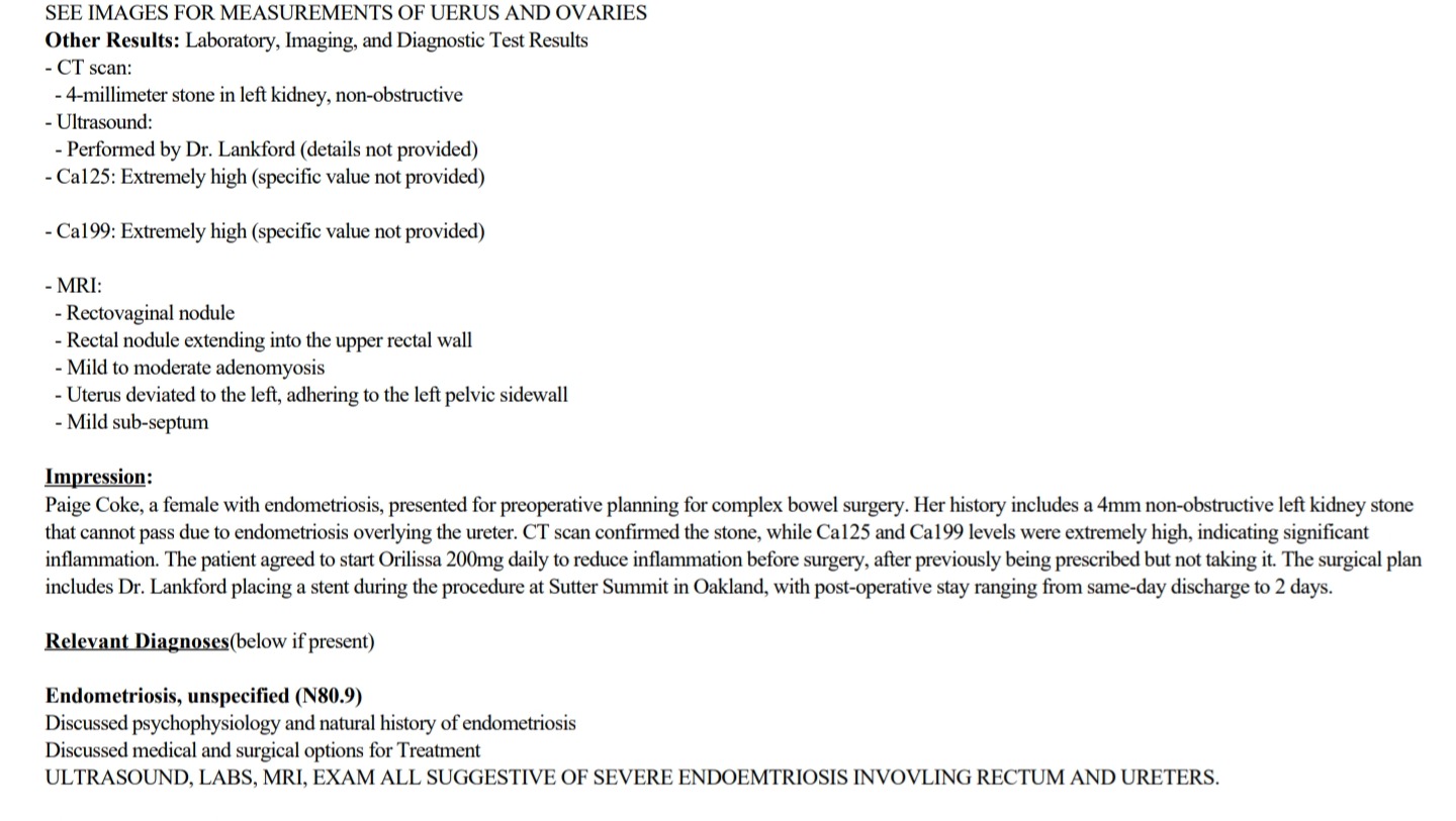 After over a decade of trying to find answers as to what was causing my pain in September of 2024 I had a laparoscopic surgery to diagnose and excise endometriosis. The doctor that performed the surgery did not feel comfortable excising anything due to the severity of the disease. The endometriosis has grown onto my uterer, bowels and abdominal wall making me stage 4. I had an appointment with an excision specialist today that is located in San Francisco that can perform the surgery alongside 2 other skilled surgeons. She is aiming for me to come down to her office for more imaging/labs within the next couple of weeks and for surgery to be 2-3 months from now.