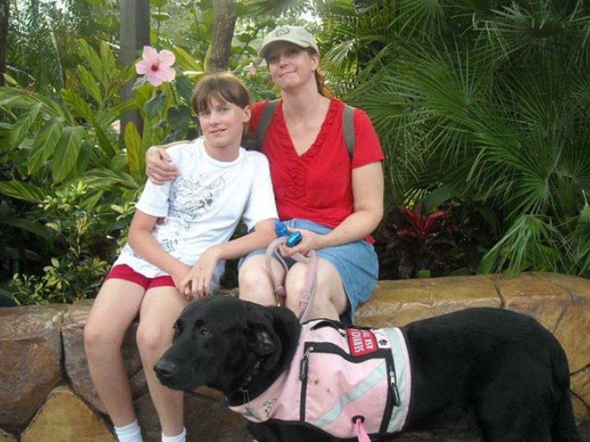 My name is Danielle Dean and this is a picture of my family. My daughter Faye, me, and my service dog Racquel. Racquel has been with me for 8 wonderful years. She is a Diabetic Alert Dog (DAD). I am a brittle Type 1 Diabetic. Racquel keeps me alive by telling me when my blood sugar is going too high or too low. I would have died years ago if she had not been with me.
