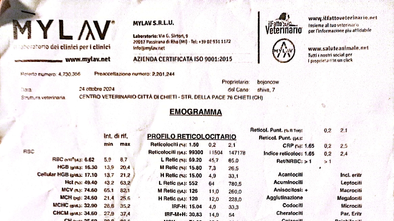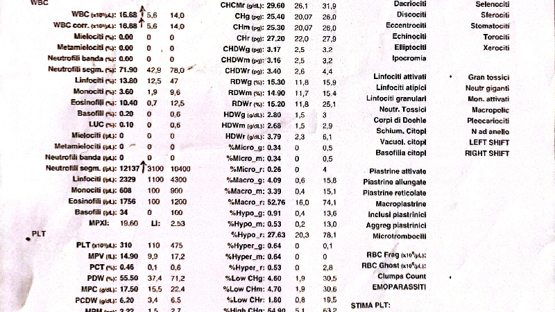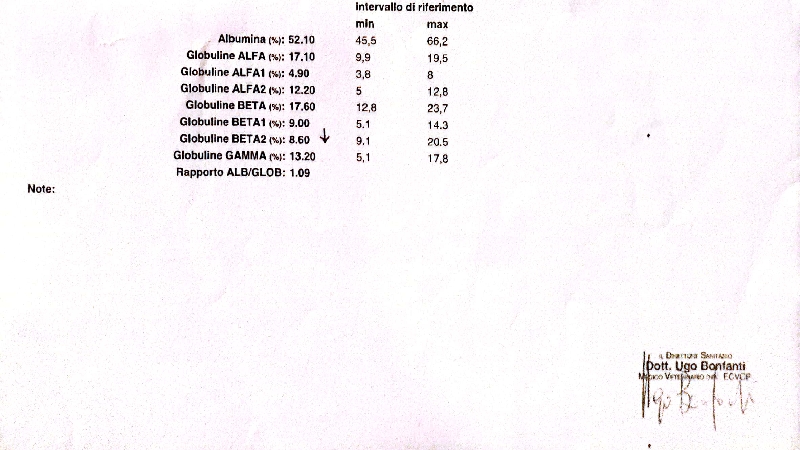 I risulti del laboratorio hanno dimostrato che non ha massa tumorale nè la lesmaniosi. La diagnosi è LIEVE POROSI PURULENTA E INFIAMMAZIONE CRONICA ZONA VOLTO.