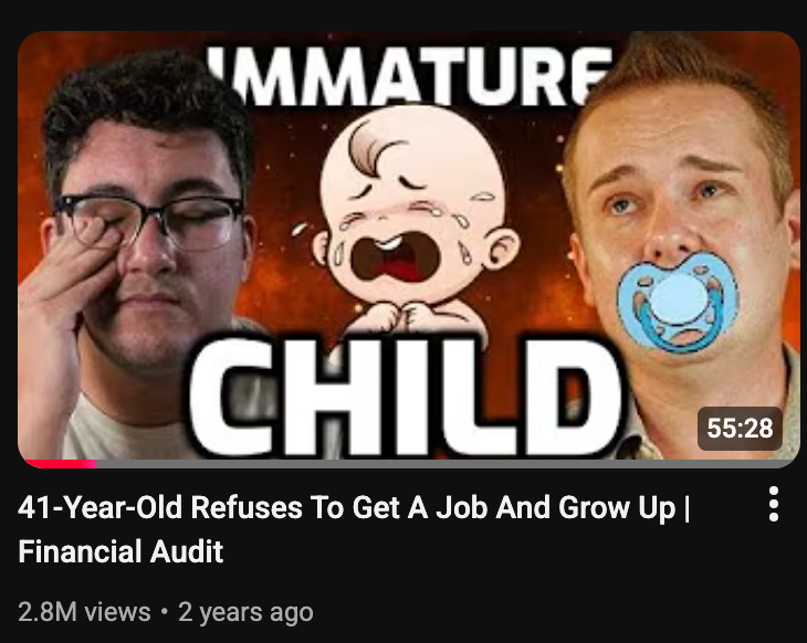 2023: I was framed without my consent as a man-child who "refuses to work." In reality, I was freelancing and explicitly stated my willingness to take any jobs I was capable of doing. I even agreed to try Uber Eats, in that episode!