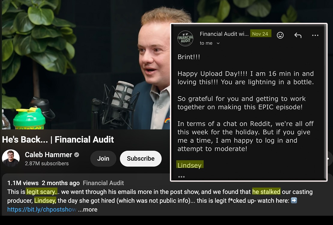 2024: I was branded a violent criminal based on the false claim that I sent Hammer death threats. In reality, I relayed threats I had received from Caleb’s vicious followers to Hammer Media, desperately seeking help from the show because the show’s characterizations had made my life hostile and unsafe.