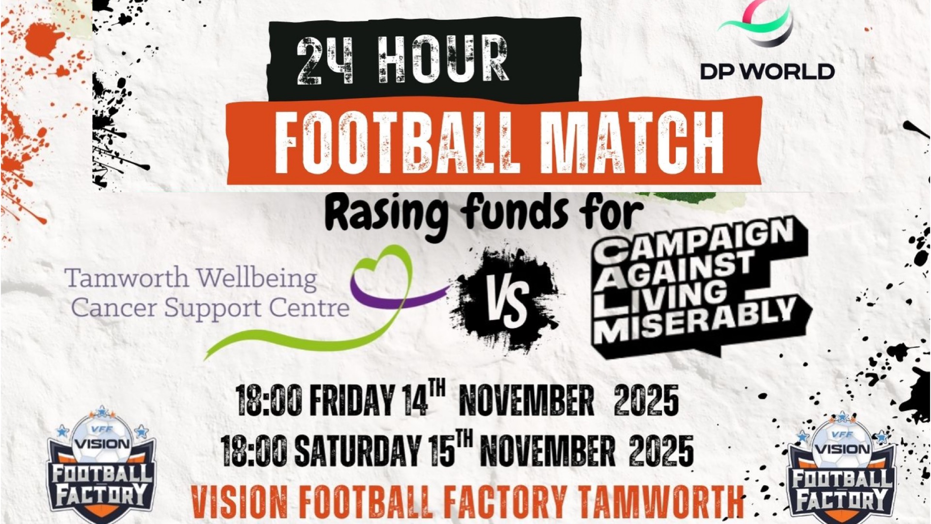 Hello, This 24-hour football match is being organised by Rob Hamilton and Grant Wyatt to raise vital funds for two incredible charities.